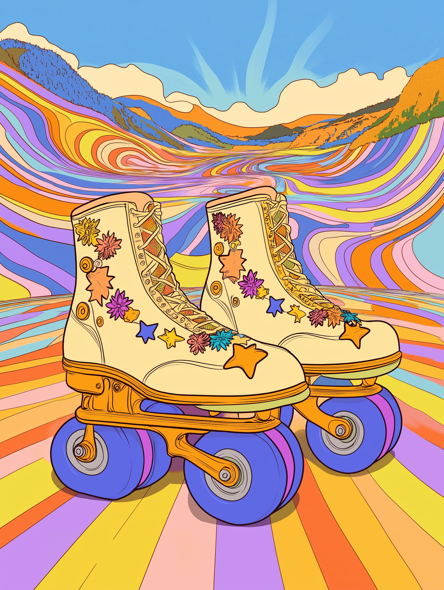 Colorful roller skates with star and flower designs in a psychedelic landscape of swirling colors and abstract hills.