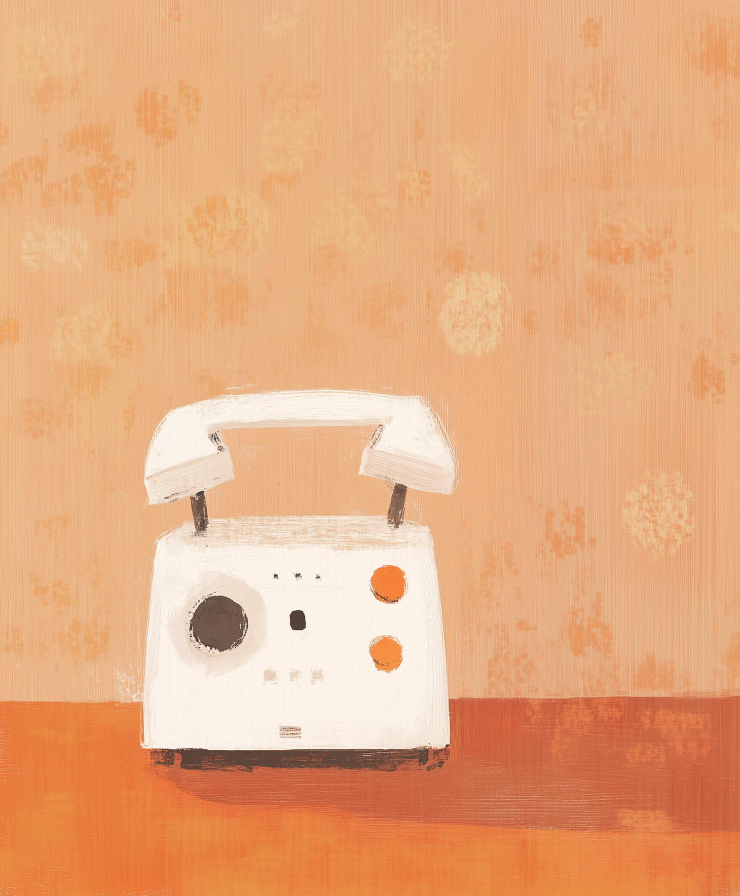 Abstract illustration of a vintage rotary phone with warm tones and minimalist design, evoking nostalgia and retro charm.