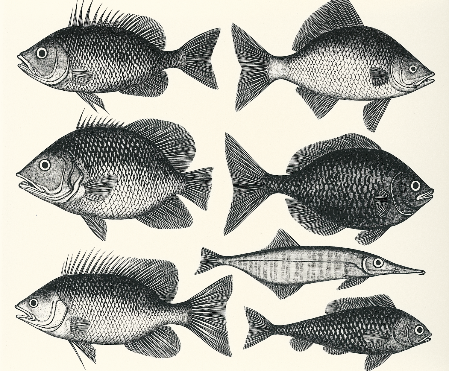 Intricate black-and-white illustration of six fish species, showcasing diverse shapes, fins, and scales in a clean, detailed style.