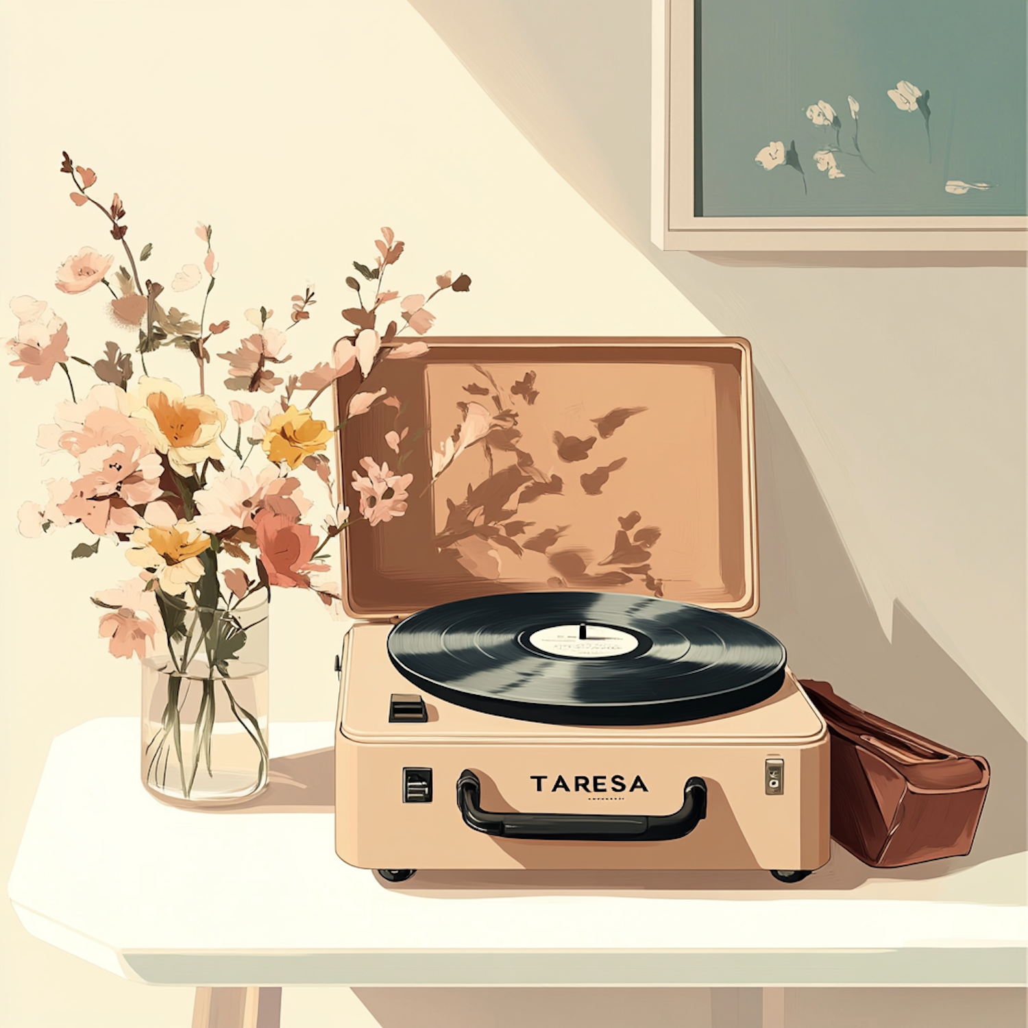 Vintage record player with vinyl, pastel flowers in a vase, and framed floral art create a nostalgic, elegant scene.