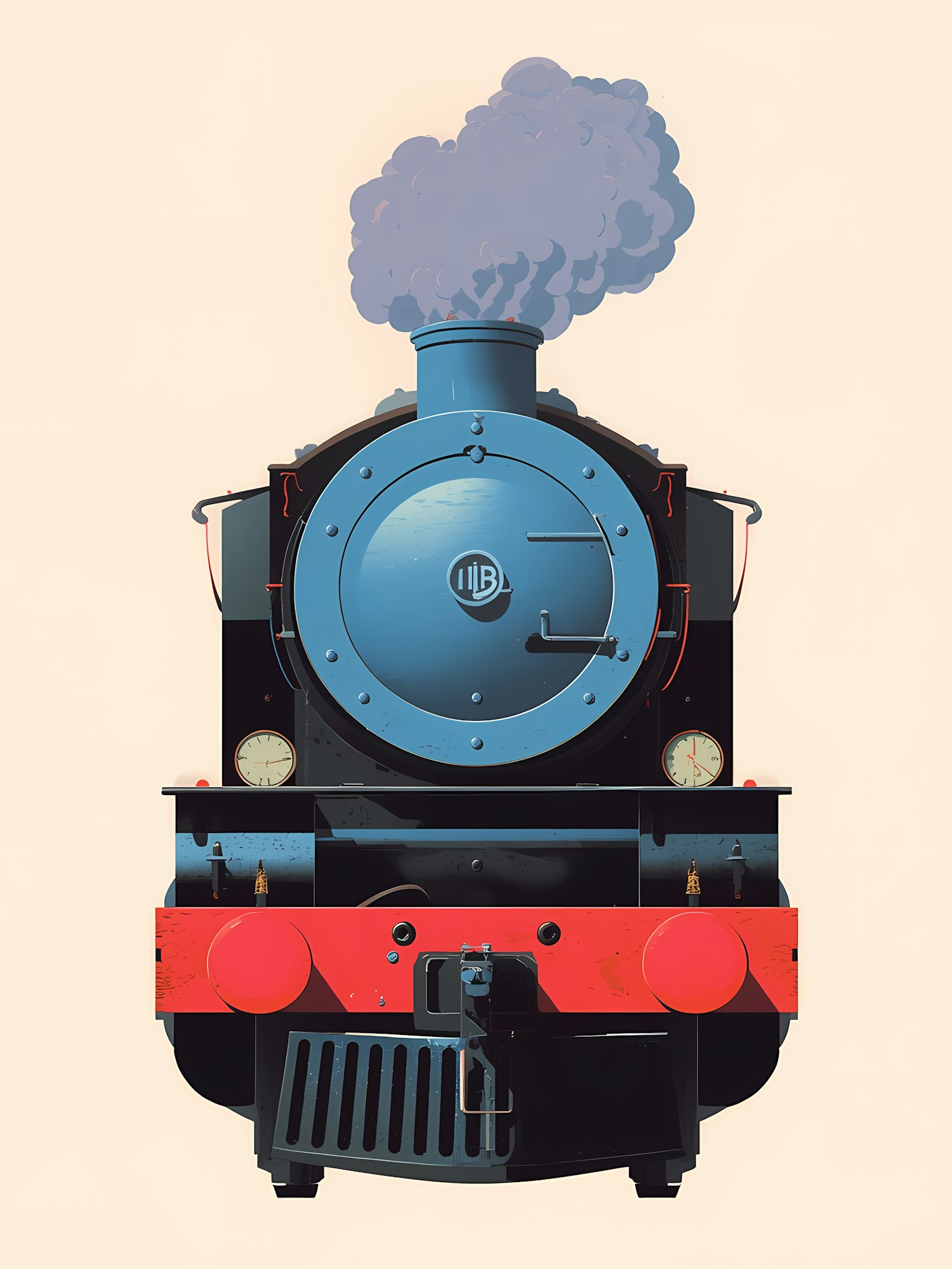 Stylized front view of a vintage steam locomotive with a blue boiler, red bumper, and billowing smoke against a beige background.