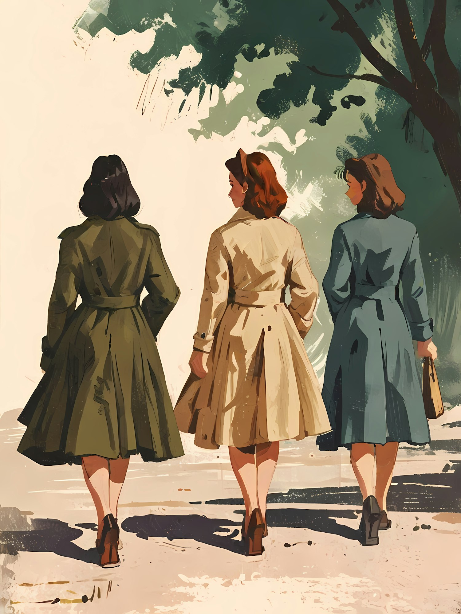 Three women wearing vintage coats walk under tree shade on a sunny day, evoking nostalgia and classic fashion.