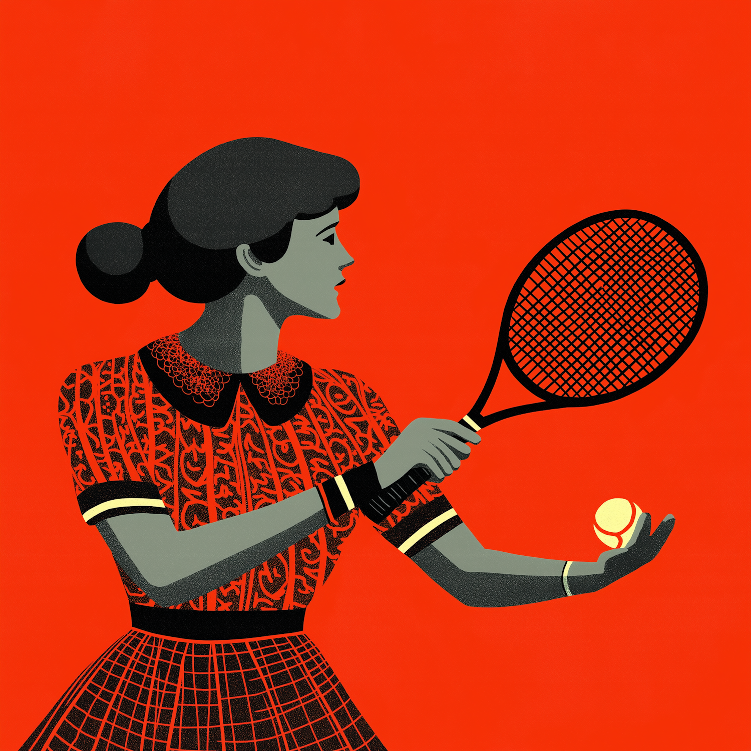 Stylized illustration of a woman in a patterned red dress holding a tennis racket and ball, set against a bold red background.