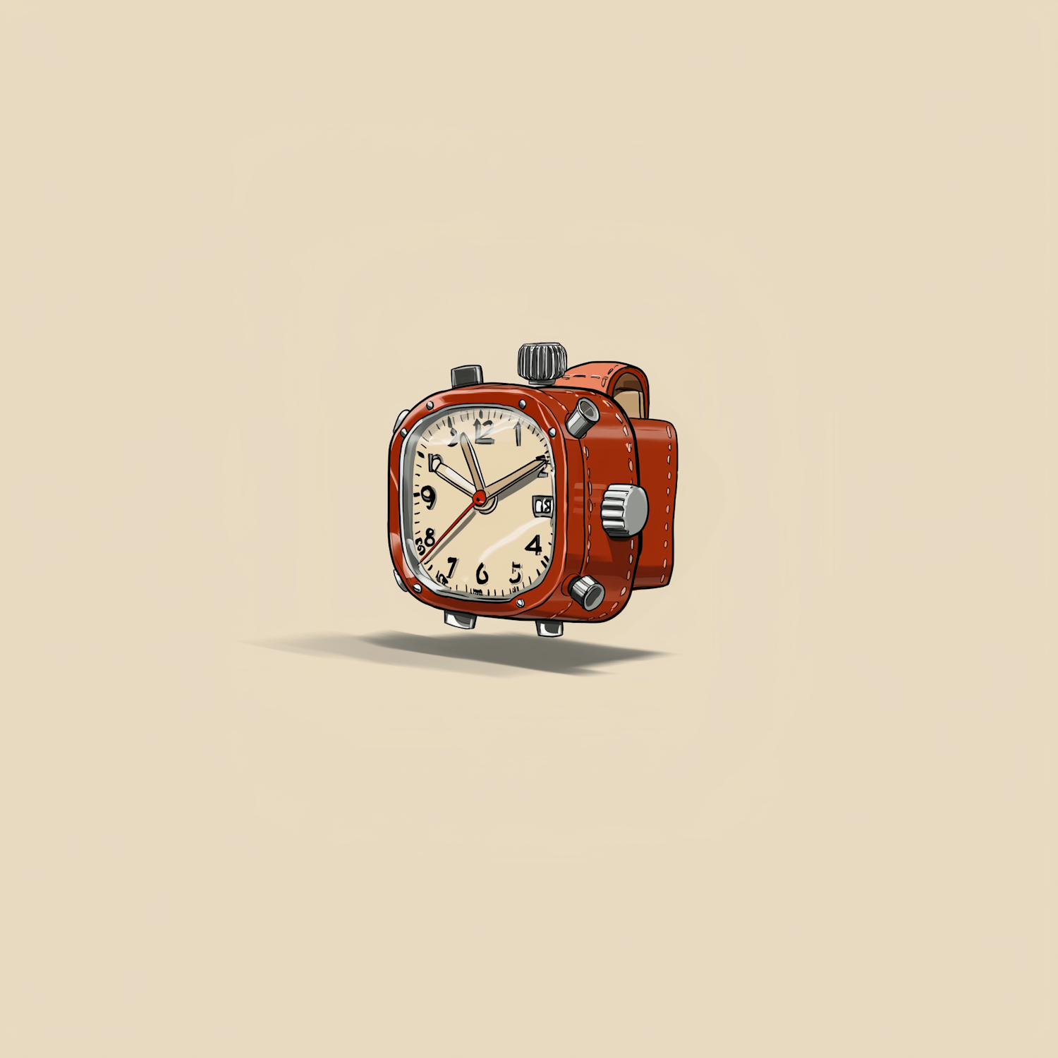 Vintage-style wristwatch illustration with a square face, cream dial, and brown leather strap on a beige background.
