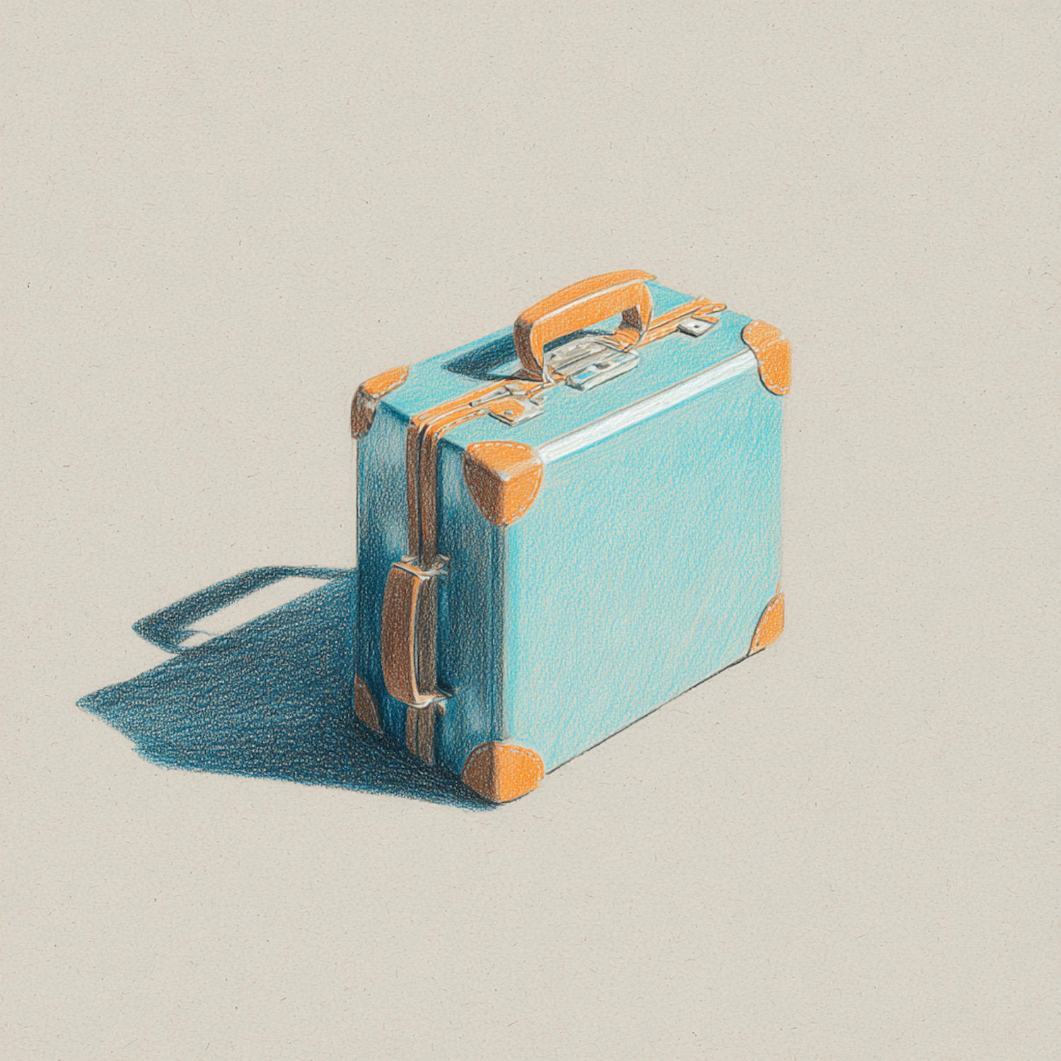 Charming illustration of a vintage blue suitcase with orange accents, set against a neutral background. Perfect for travel or retro themes.