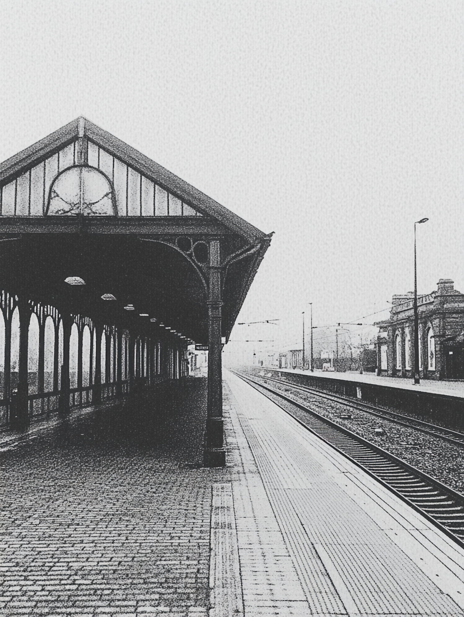 Vintage black-and-white train station with ornate columns, brick platform, and tracks leading into the distance. Quiet and timeless.