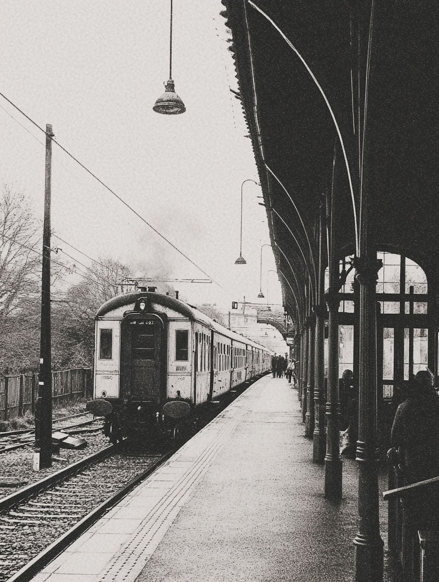 Vintage black-and-white train station scene with a classic train, ornate platform roof, and hanging lamps, evoking a nostalgic atmosphere.