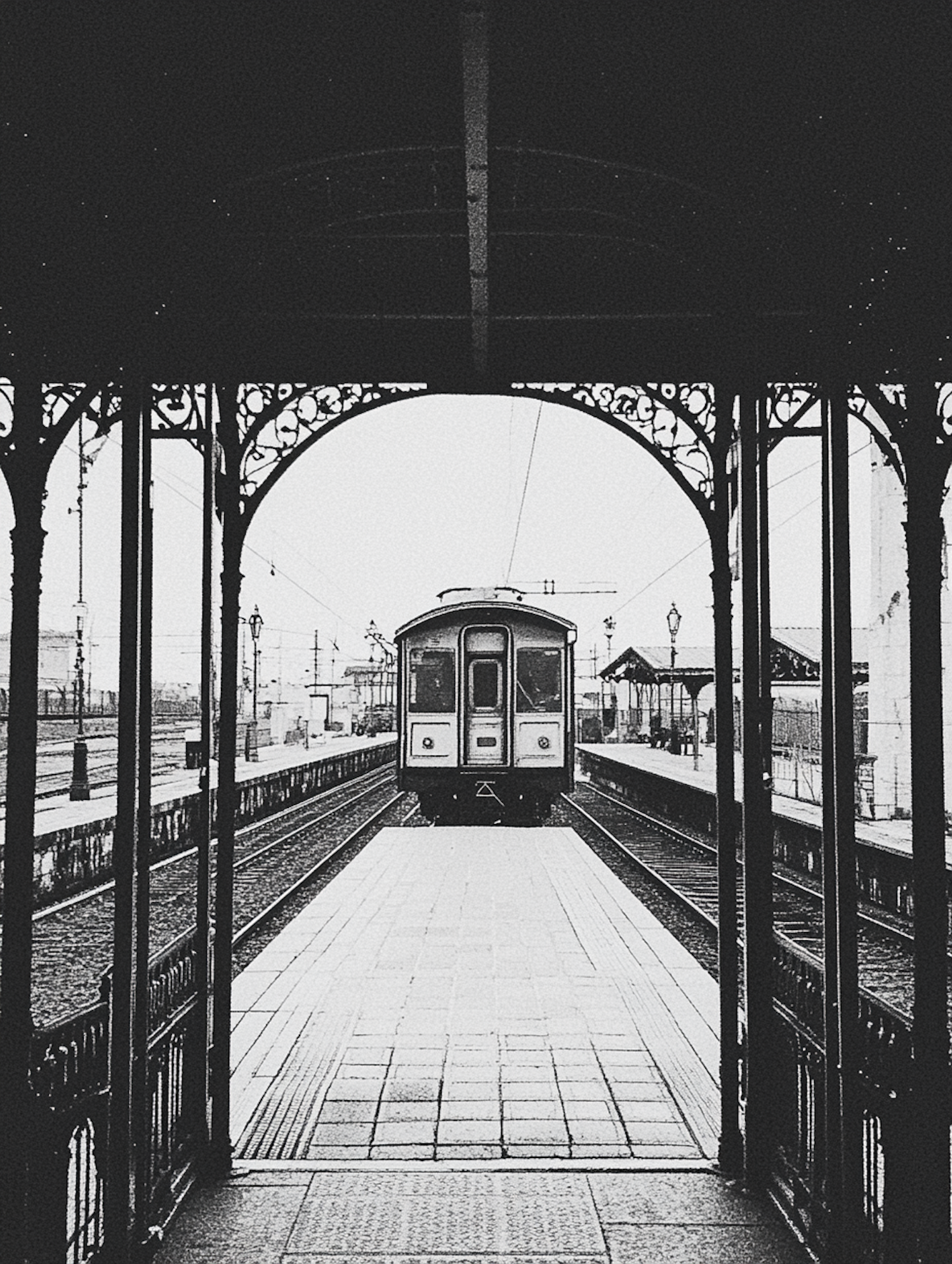 Black-and-white photo of a vintage train station with ornate ironwork arches and a stationary train on the tracks.
