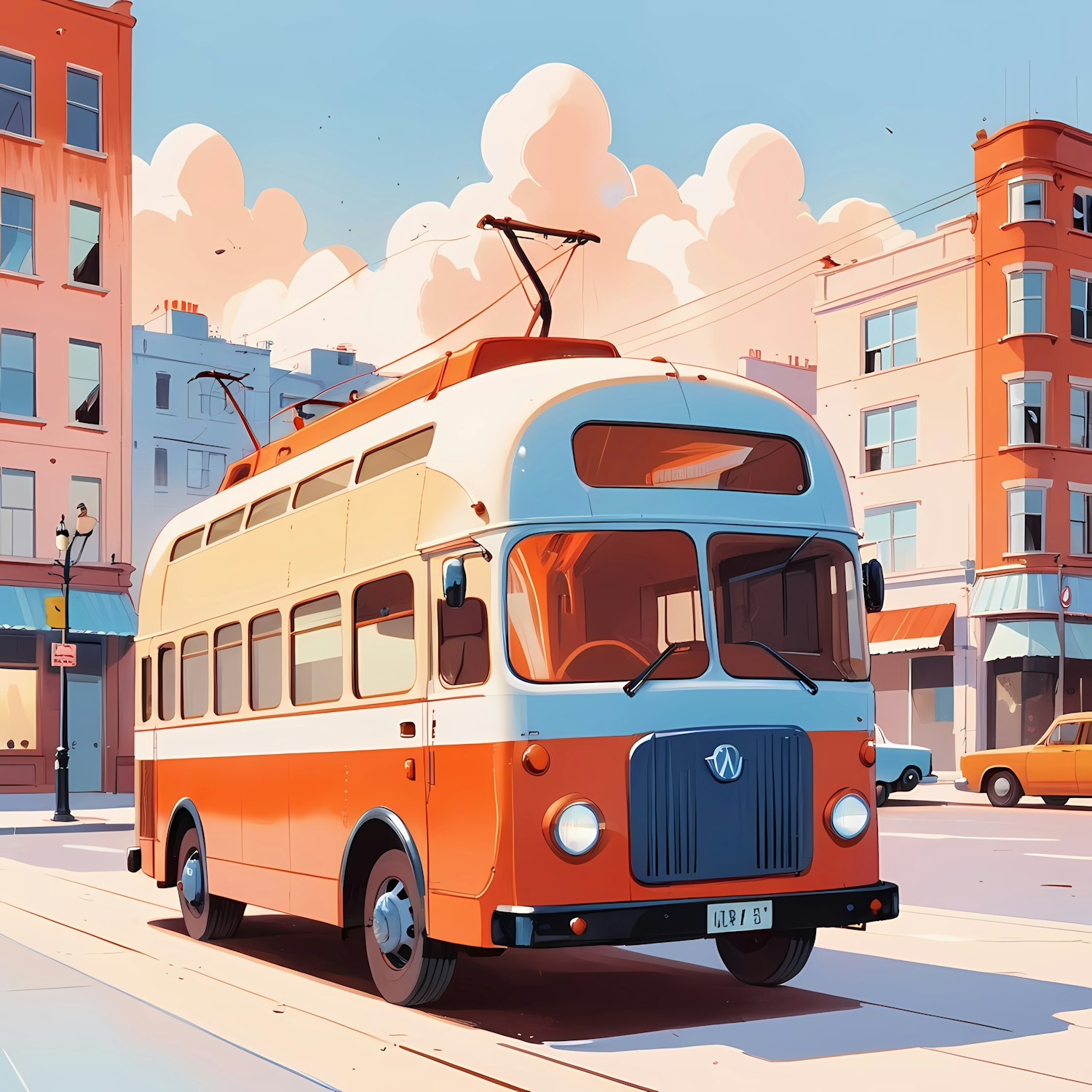 Retro orange and white trolleybus on a sunny city street with pastel buildings and a vintage car nearby. Nostalgic and vibrant illustration.