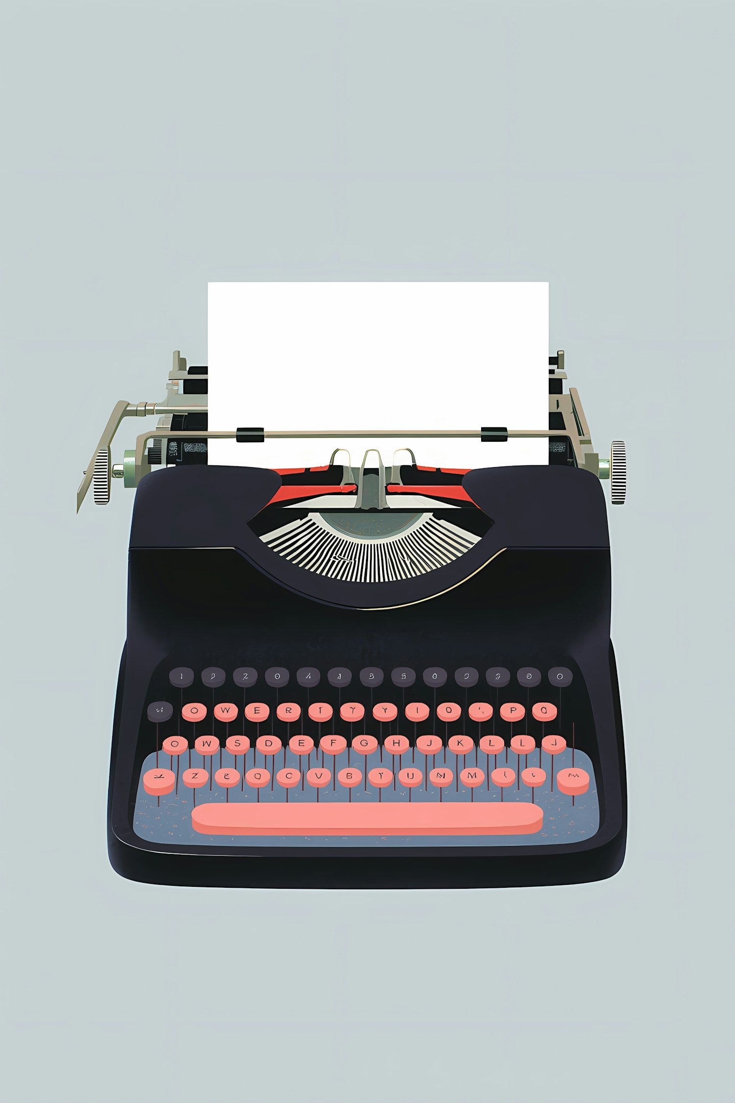 A minimalist illustration of a vintage black typewriter with coral keys and a blank sheet of paper, set against a light gray background.