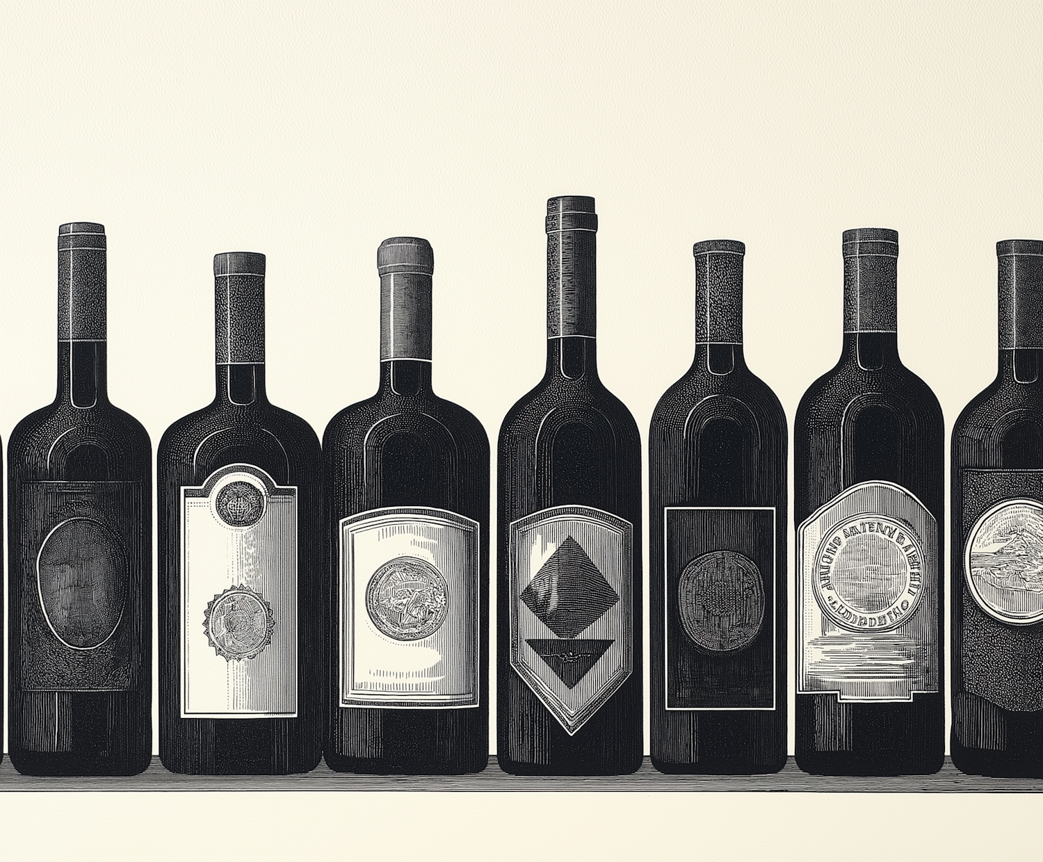 Monochromatic illustration of seven wine bottles with unique labels, showcasing elegant design and intricate patterns.