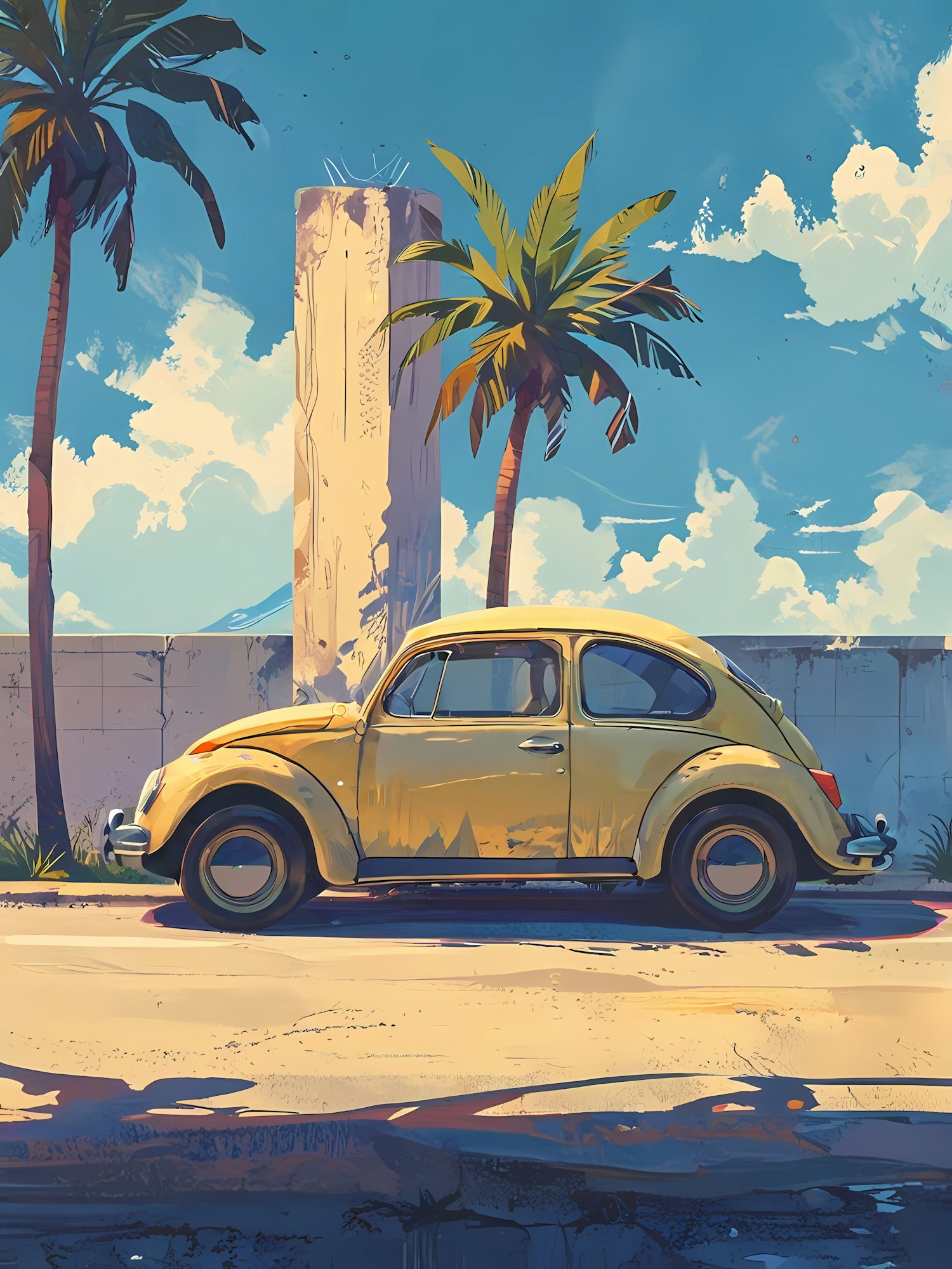 Vintage yellow Volkswagen Beetle parked under palm trees with a clear blue sky, evoking a nostalgic summer vibe.