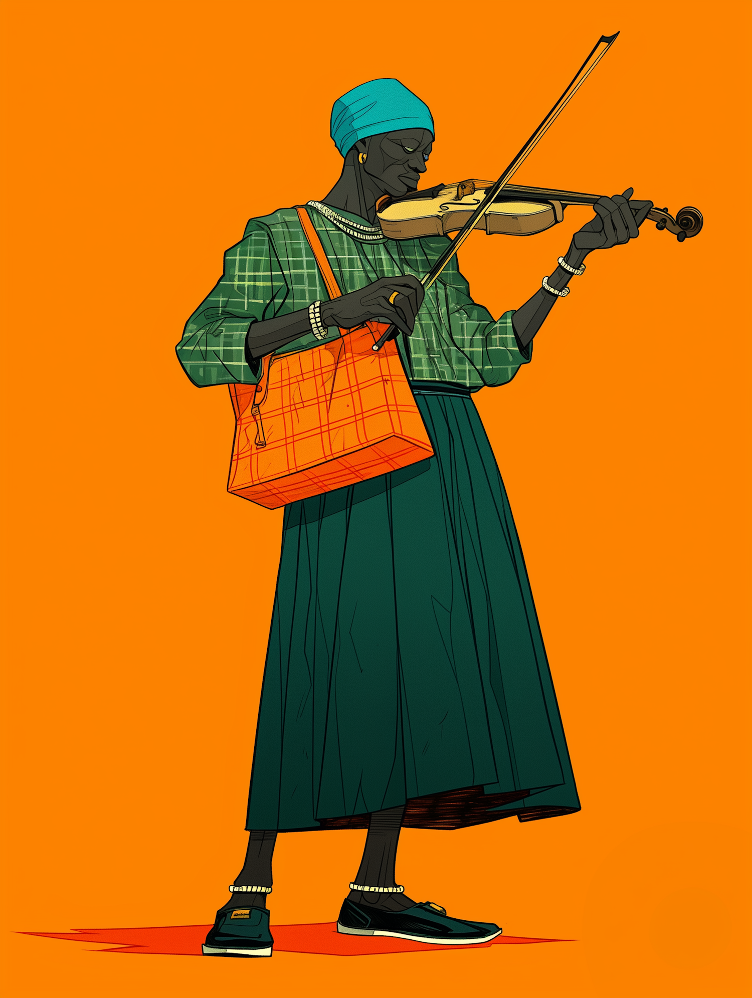 Illustration of a woman playing violin, wearing a blue headscarf, green plaid shirt, and orange bag, set against a vibrant orange background.
