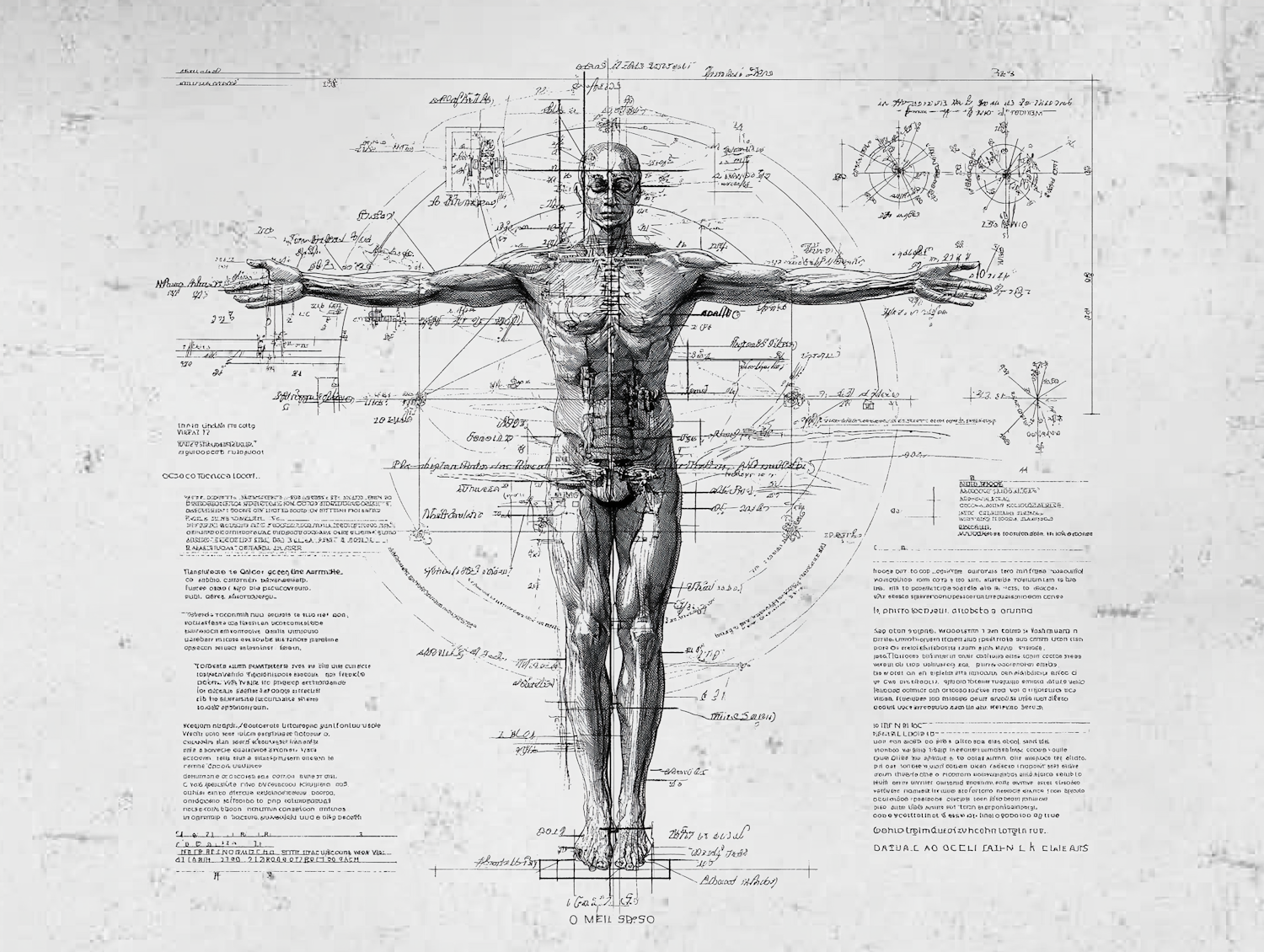 An intricate anatomical and geometrical illustration of a human figure, surrounded by measurements and annotations, inspired by Vitruvian principles.