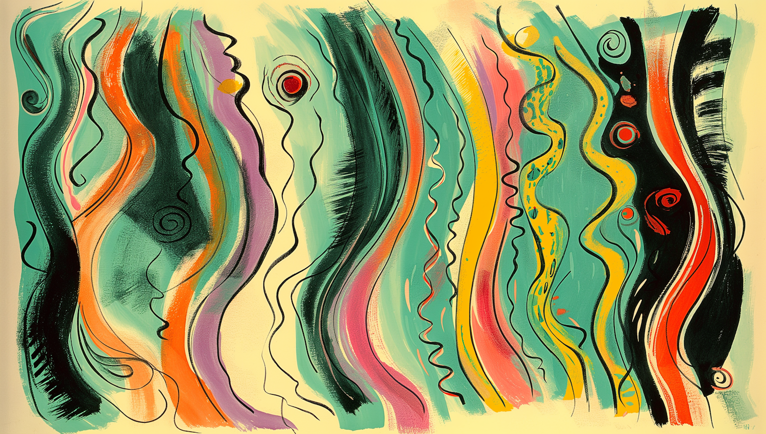 Vibrant abstract painting with swirling lines in teal, orange, pink, and black on a soft yellow background. Energetic and whimsical.