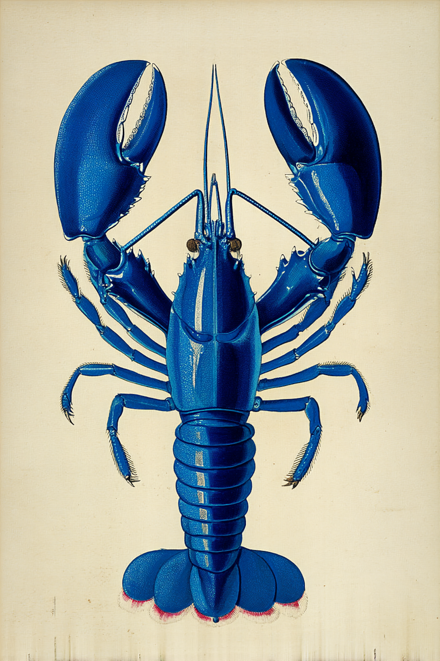 Intricately detailed artwork showcasing a brilliant blue lobster with striking contrast against a subtle beige backdrop.