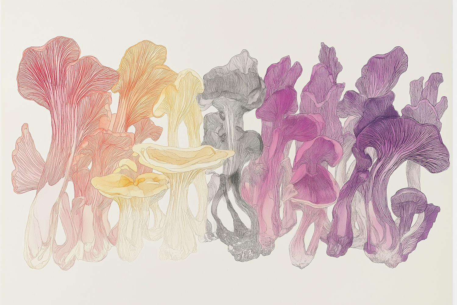 Colorful mushroom illustration with gradient hues from red to purple, showcasing intricate details and artistic flair.