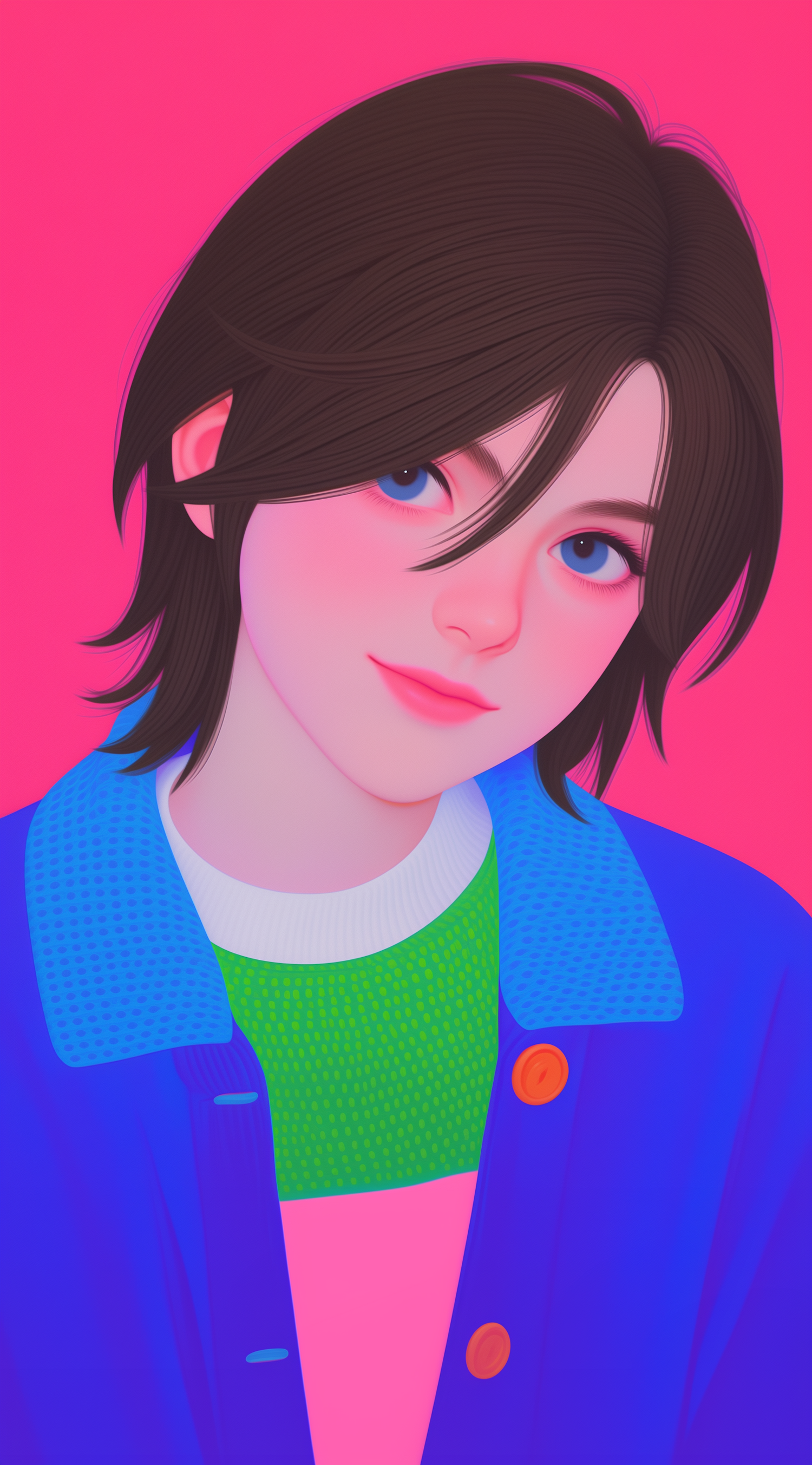 A colorful digital illustration of a young person with layered dark hair, blue eyes, and a vibrant outfit against a bright pink background.