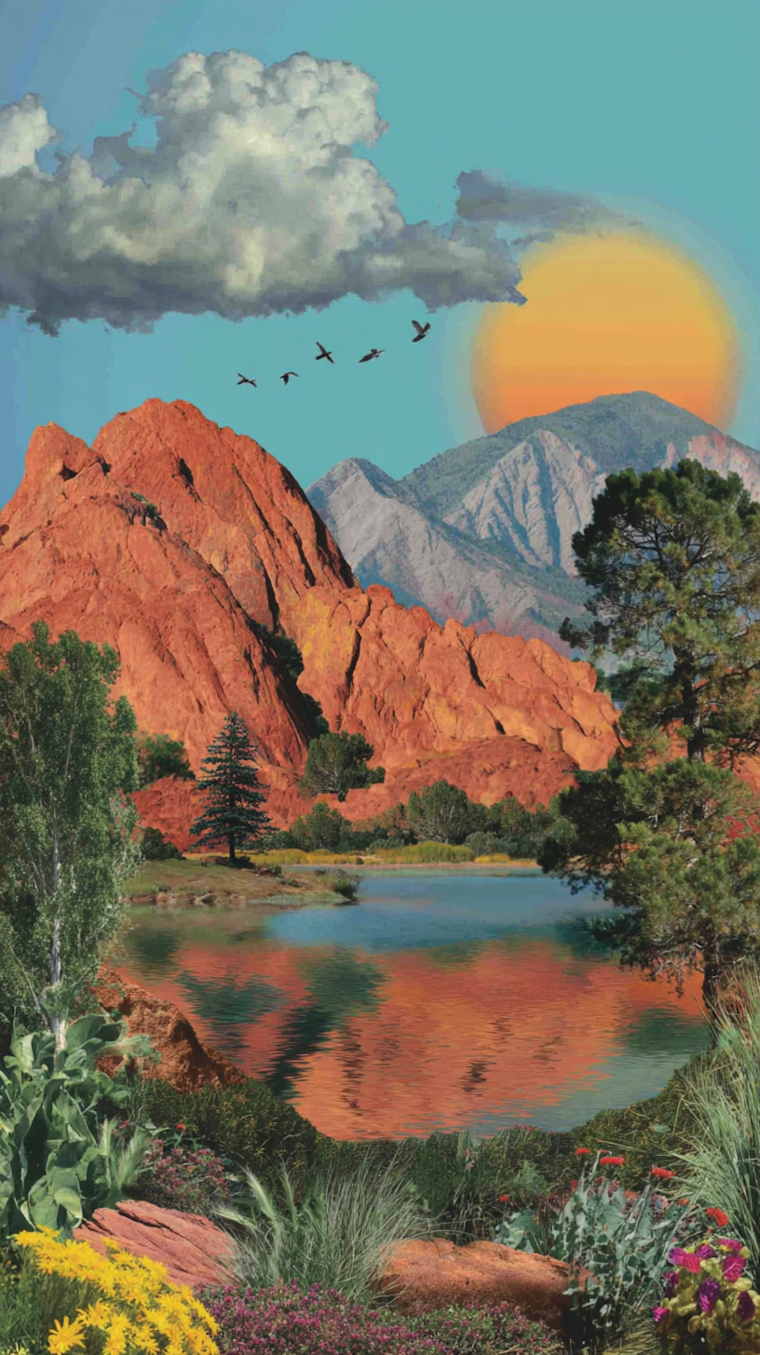 A colorful landscape with red rocks, a serene lake, and vibrant wildflowers under a bright sun and a flock of birds.