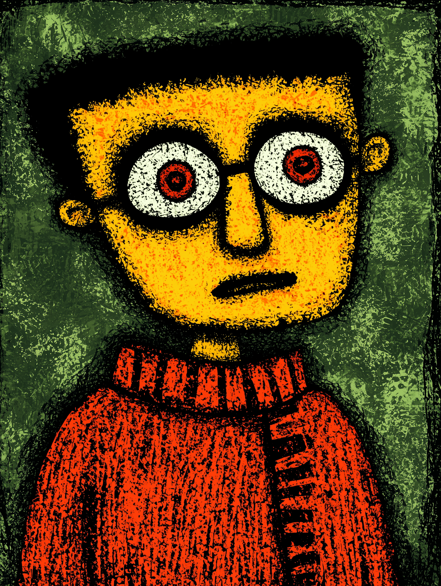 Stylized illustration of a cartoonish figure with large spiral eyes, yellow face, and red sweater against a textured green background.