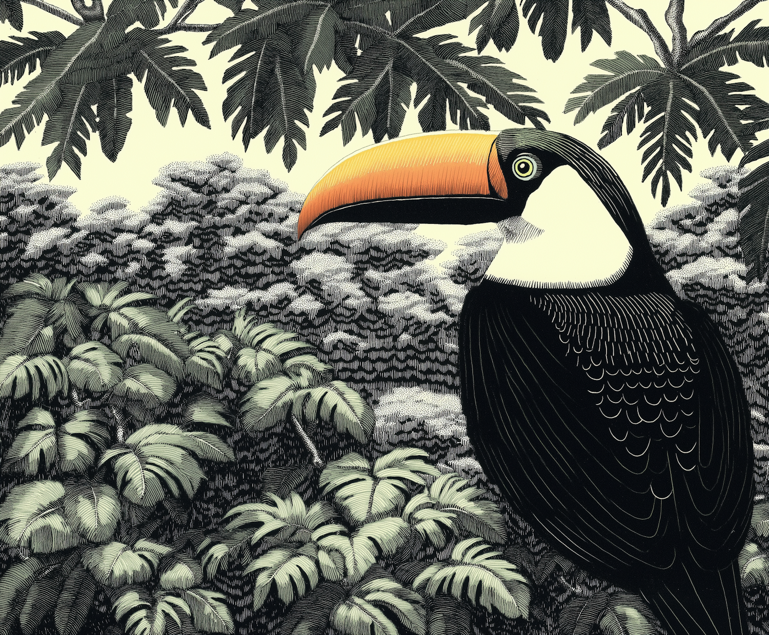 Illustration of a toucan with a vivid orange beak in a lush tropical jungle setting, surrounded by detailed green foliage.