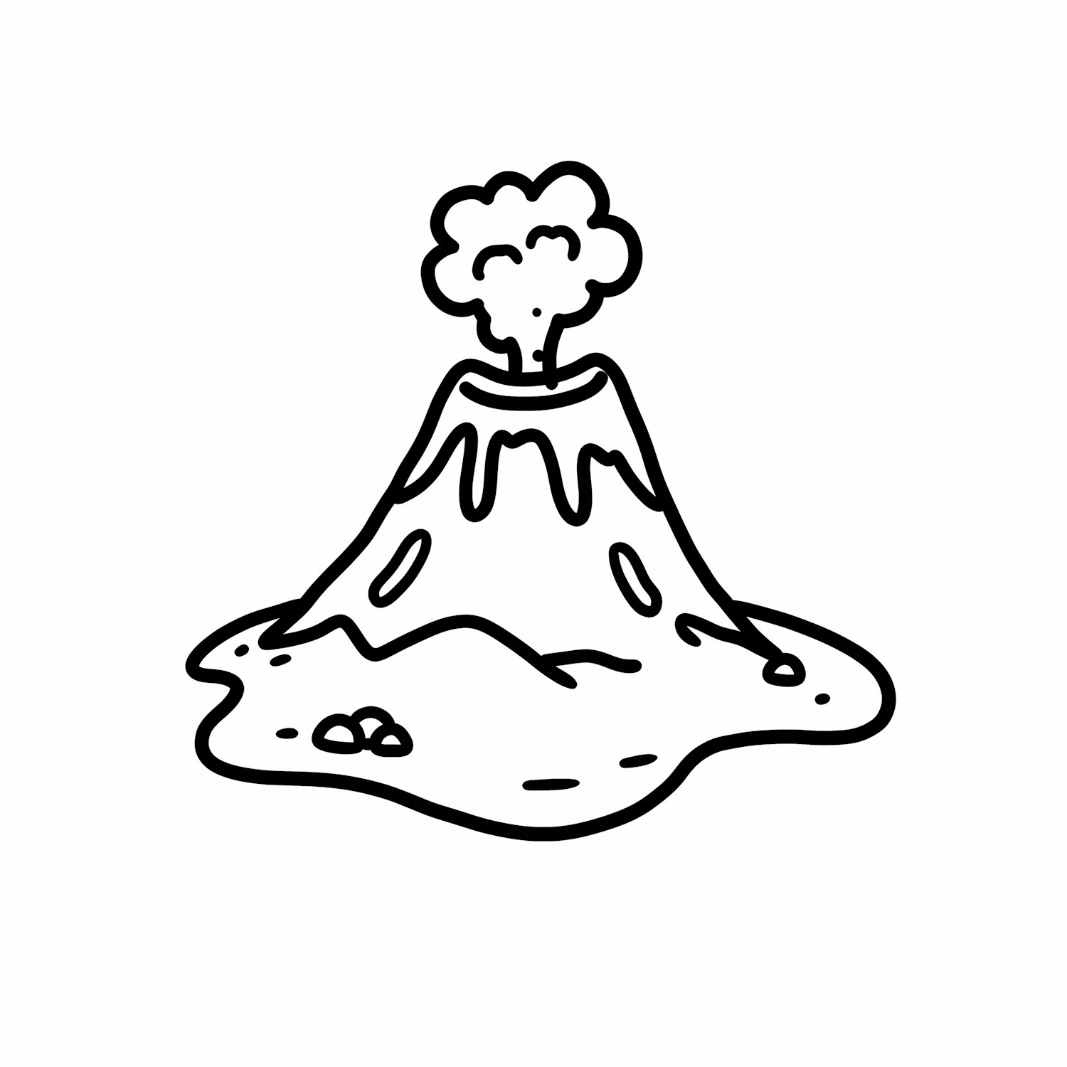 A minimalistic black-and-white line drawing of a volcano with smoke and lava, perfect for educational or creative uses.