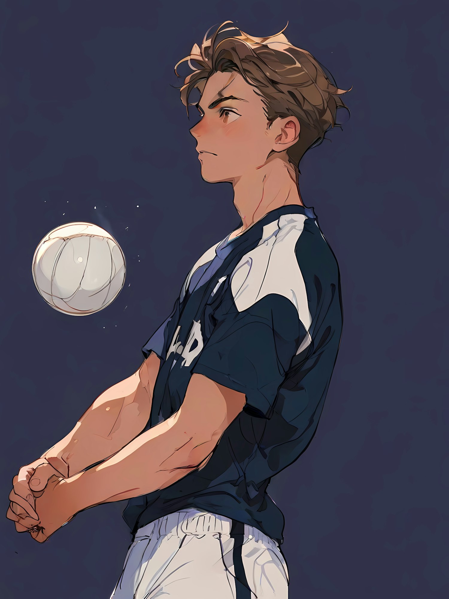 Dynamic illustration of a focused volleyball player in action, wearing a navy and white jersey with a hovering volleyball.