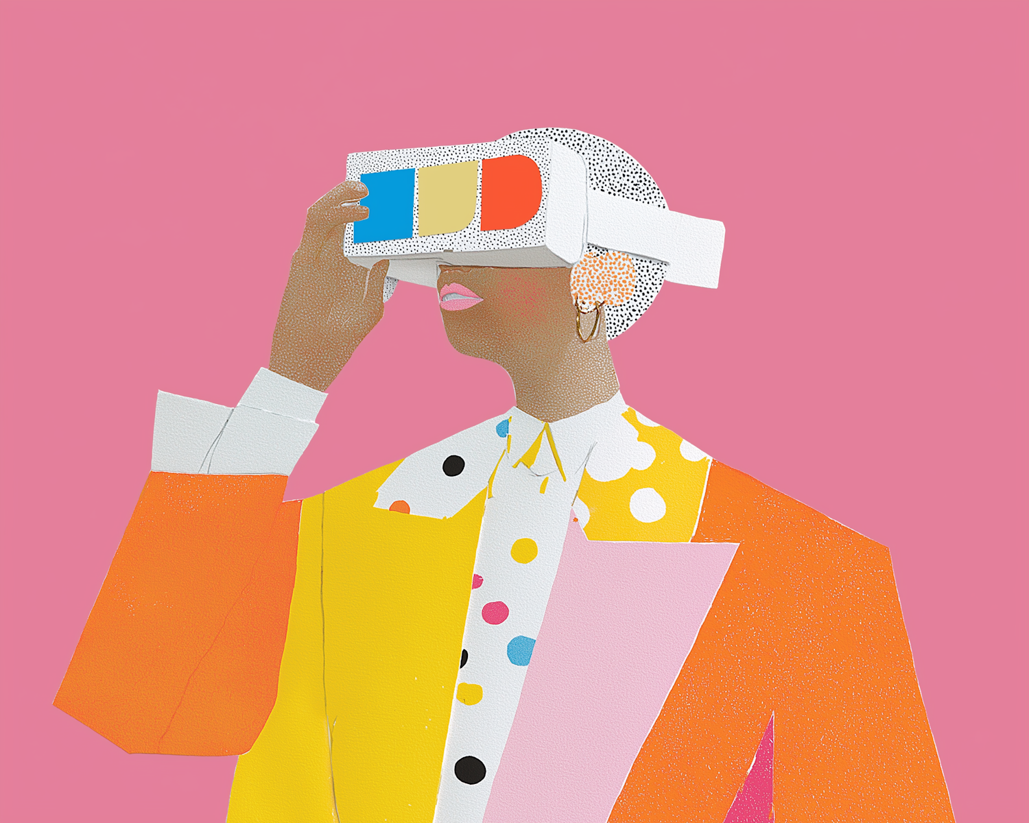 A colorful illustration of a person in a vibrant outfit using a VR headset, set against a pink background.