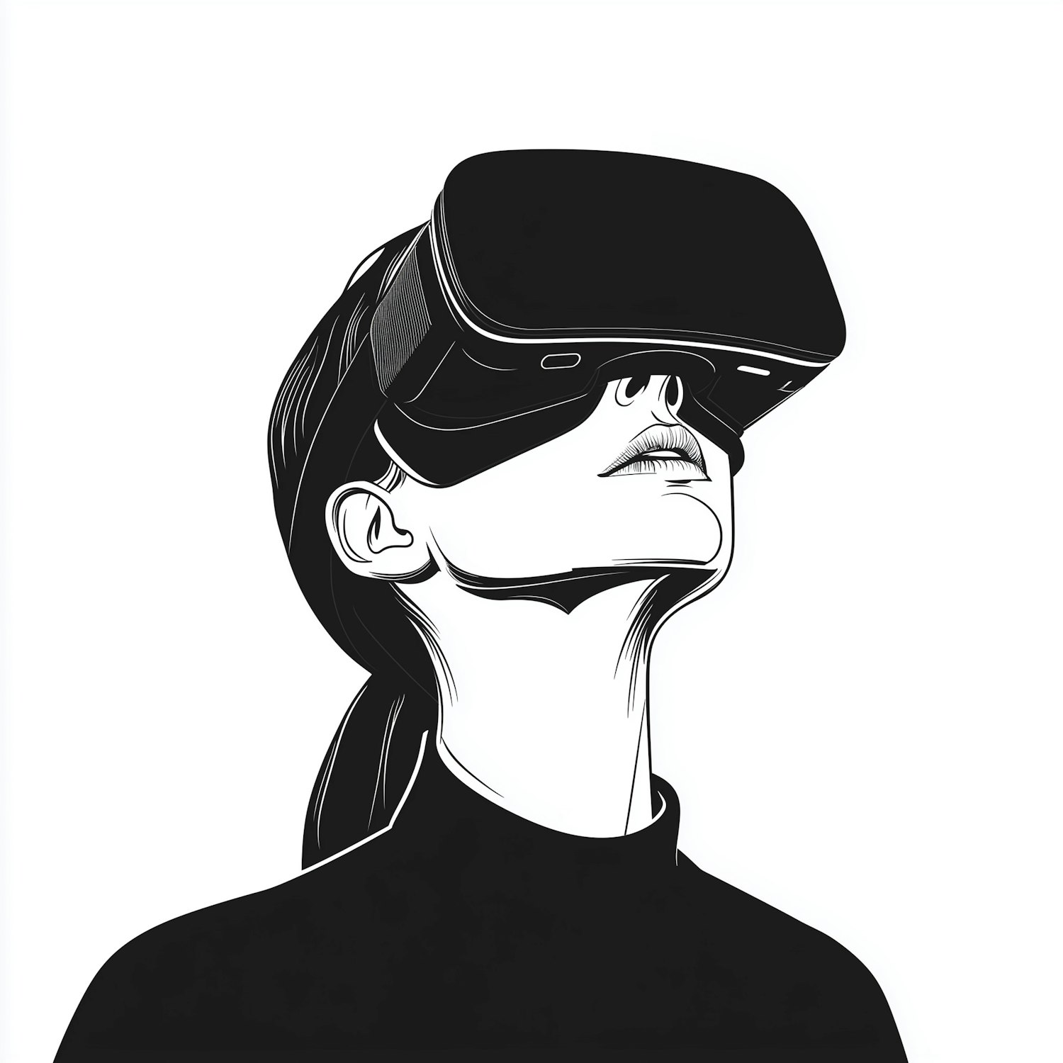 Minimalist black-and-white illustration of a person wearing a VR headset, head tilted upward, immersed in a virtual experience.