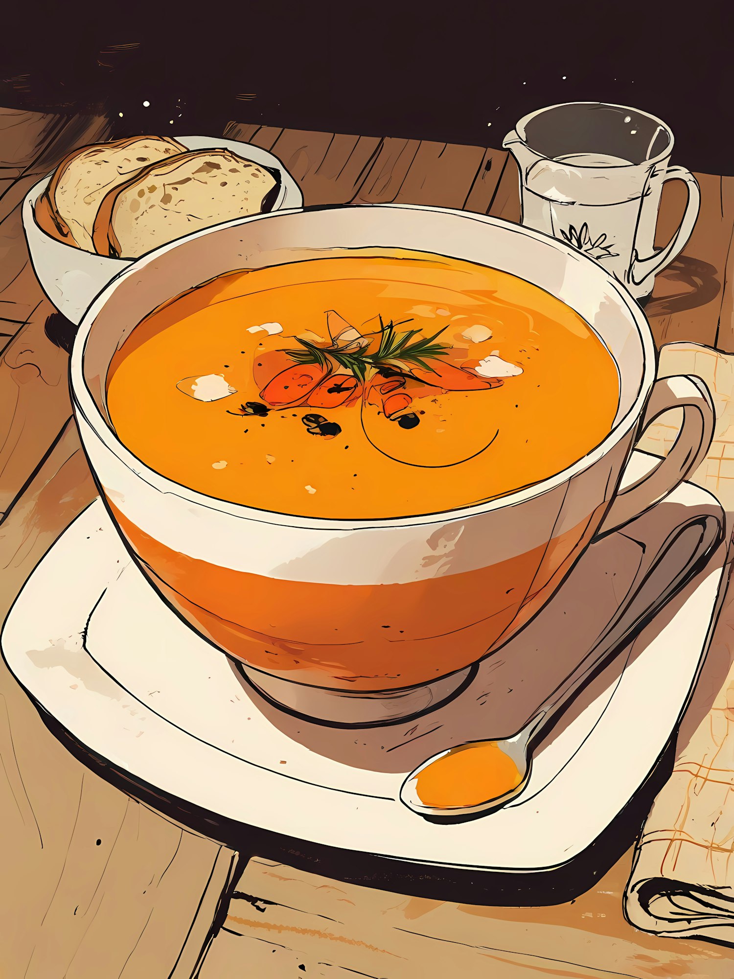 Illustration of a creamy orange soup with herbs, bread slices, and a glass pitcher on a wooden table.