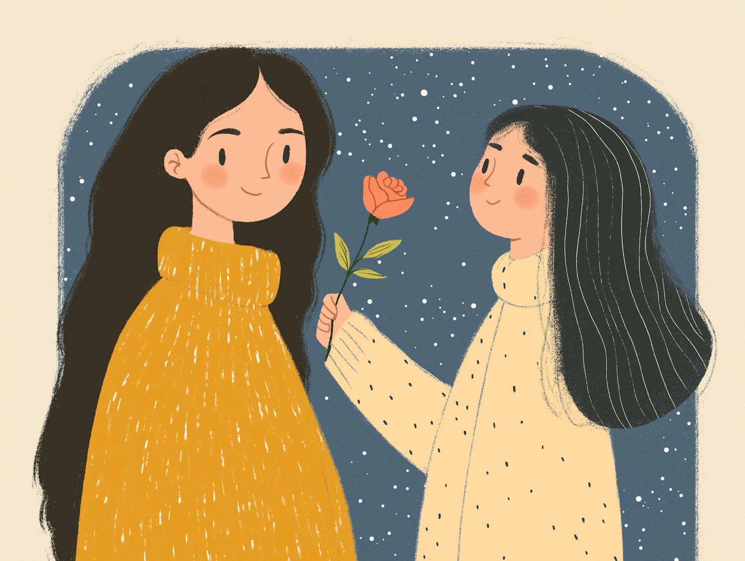 Two cartoon characters share a moment under a starry sky, exchanging a flower with warmth and affection.