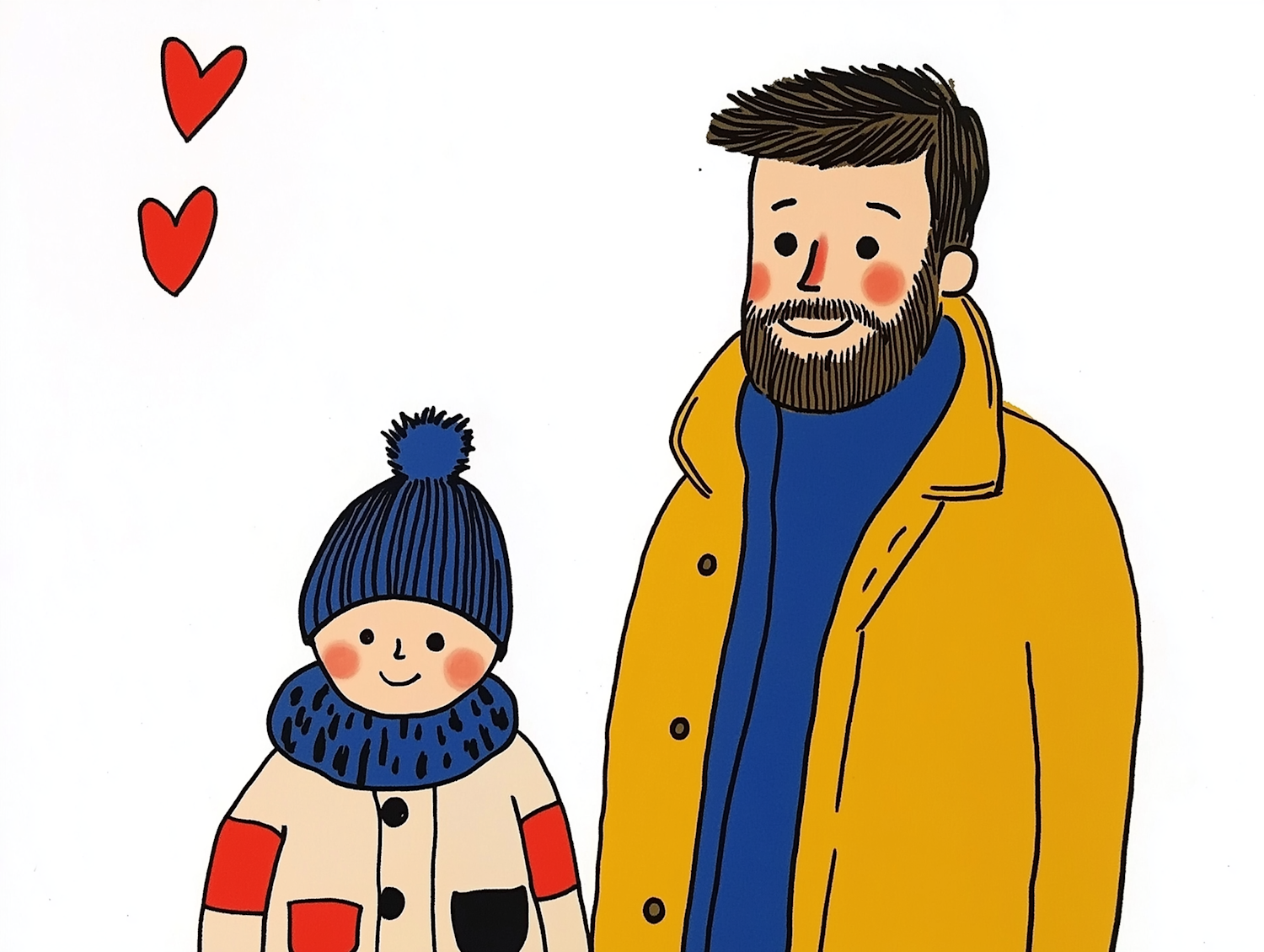Illustration of a father and child in winter attire with hearts, showcasing warmth and affection.