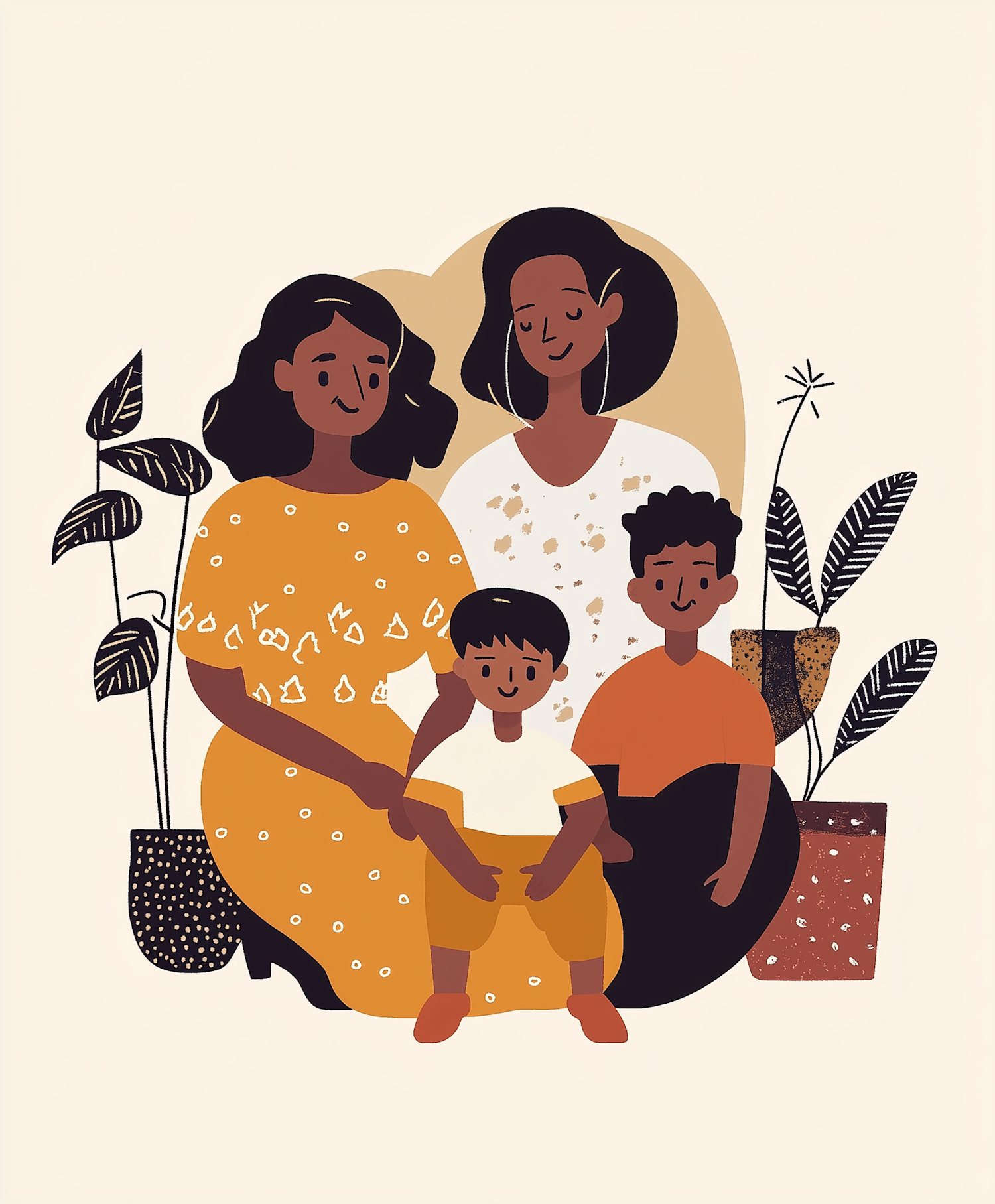Illustration of a happy family with two adults and two children, surrounded by potted plants. Warm colors and simple, joyful design.