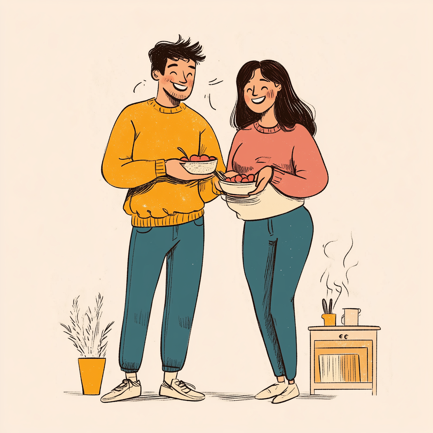 Illustration of a smiling couple holding fruit bowls, wearing colorful sweaters. Cozy home setting with a steaming cup and potted plant.