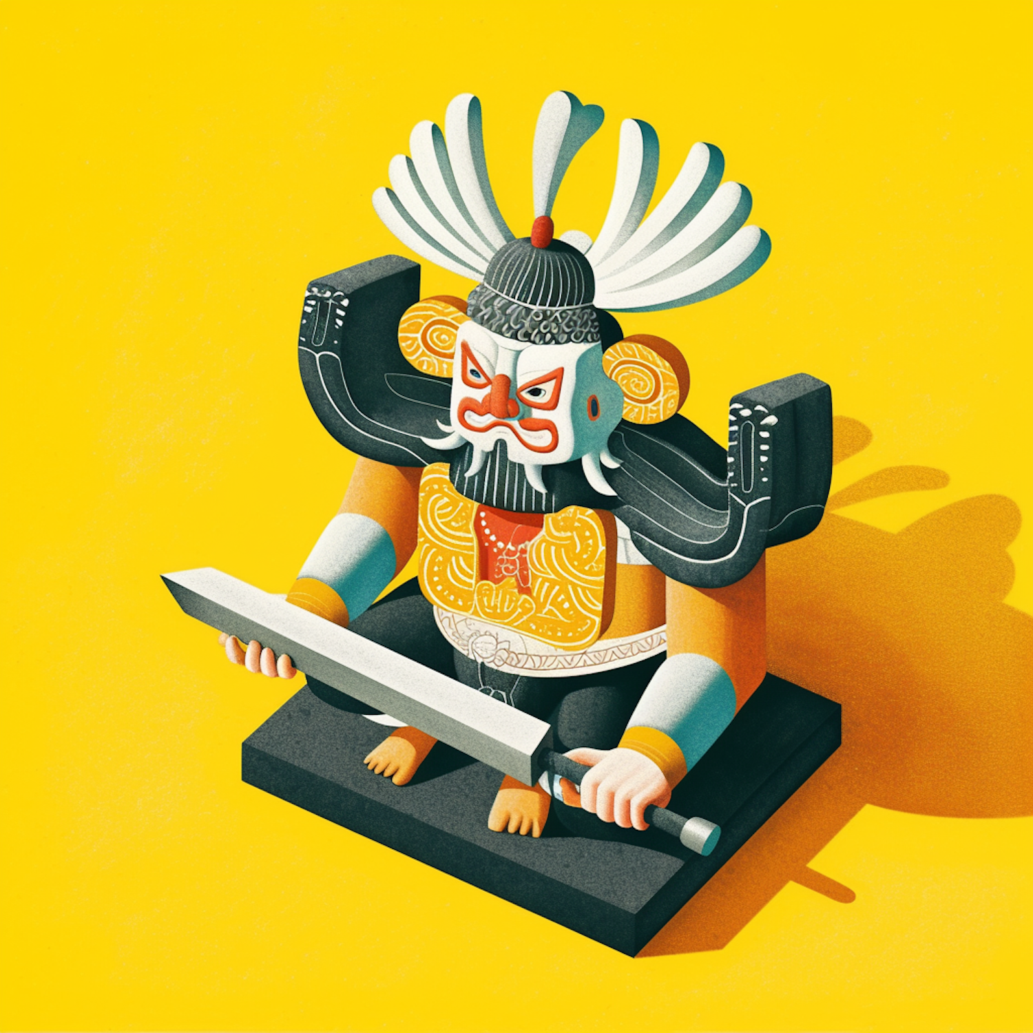 Stylized warrior illustration with ornate armor, dramatic headdress, and sword on a bright yellow background.