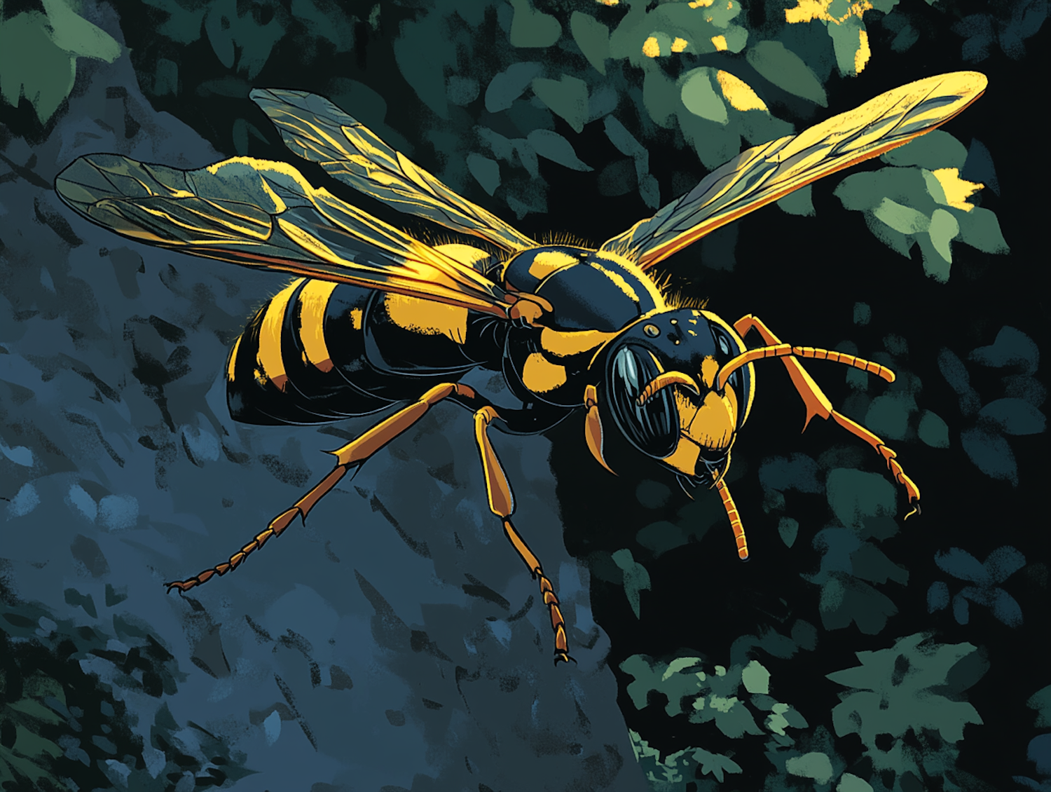 Vibrant illustration of a wasp in flight with detailed yellow and black stripes, set against a dark green foliage background.