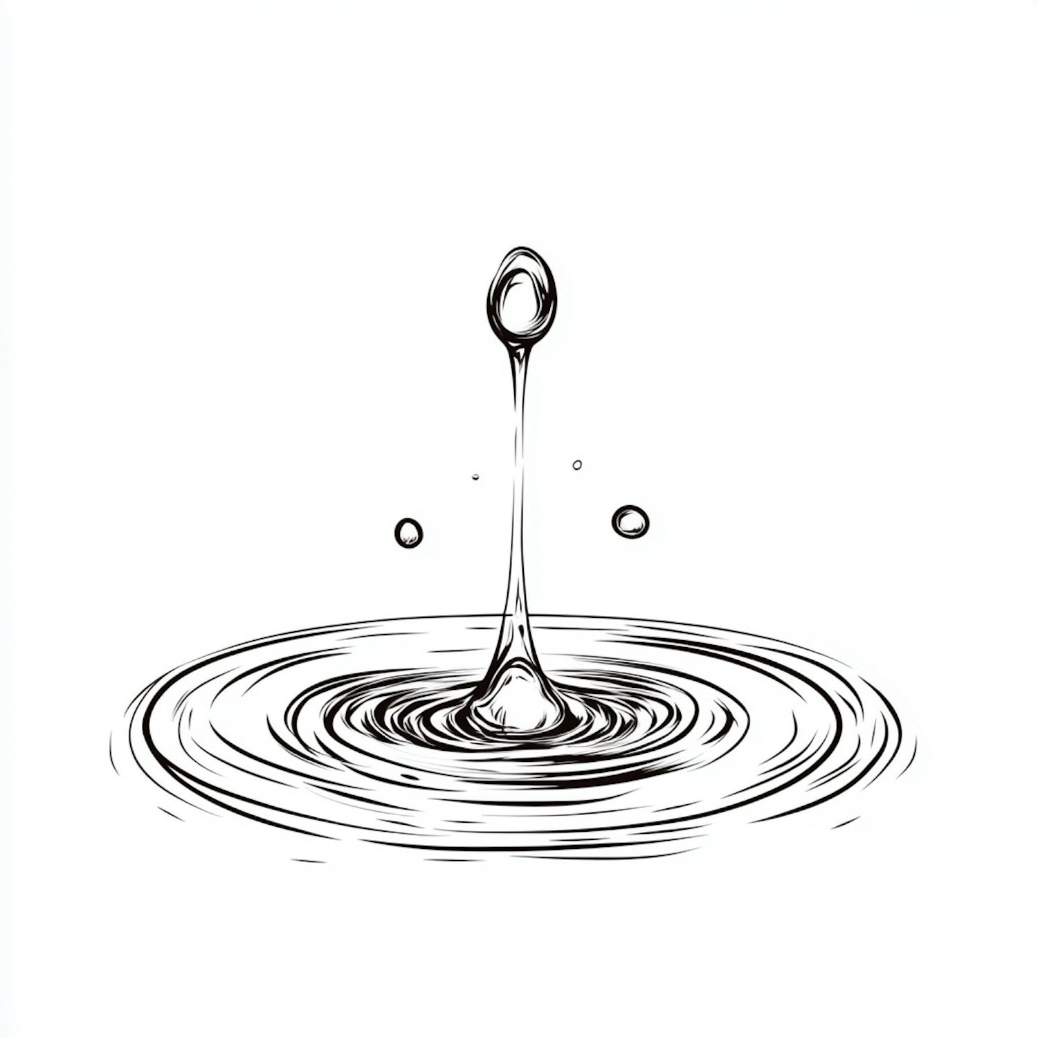 Minimalist black-and-white illustration of a water droplet mid-splash with concentric ripples on a clean white background.