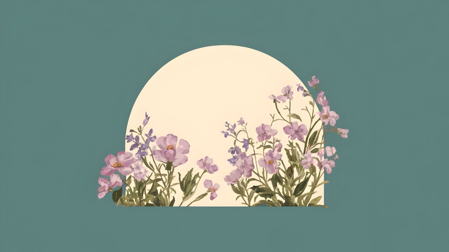 Minimalist floral illustration with purple flowers, a beige sun, and a teal background. Perfect for serene and artistic decor.