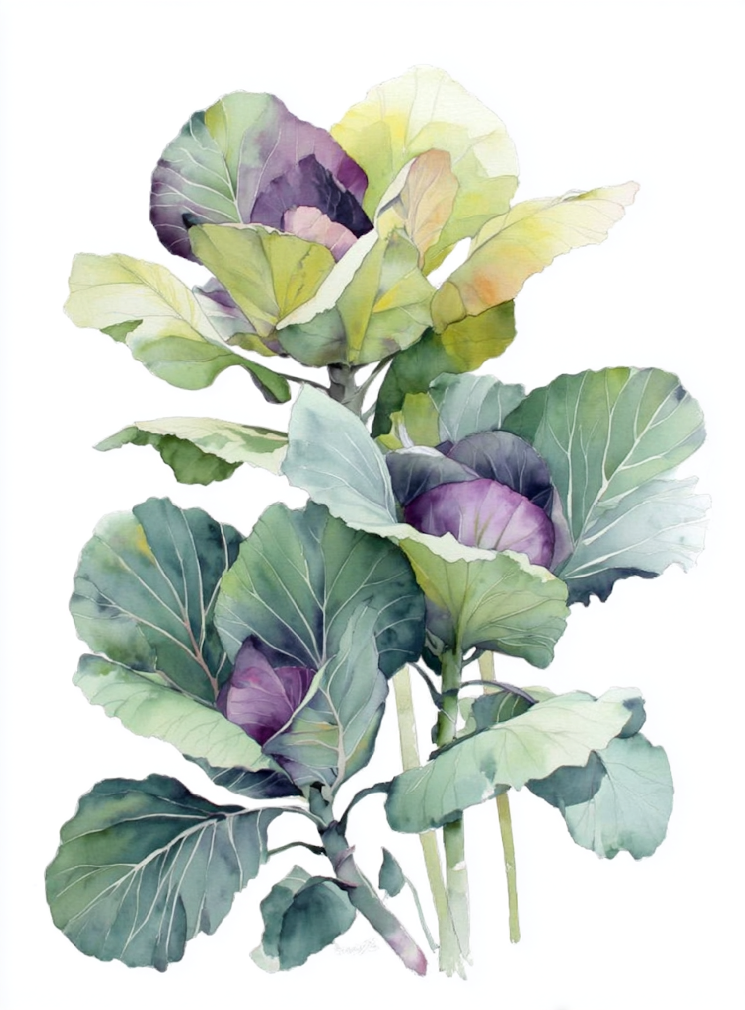 A beautiful watercolor illustration of leafy plants with green and purple hues, showcasing intricate details and a naturalistic style.