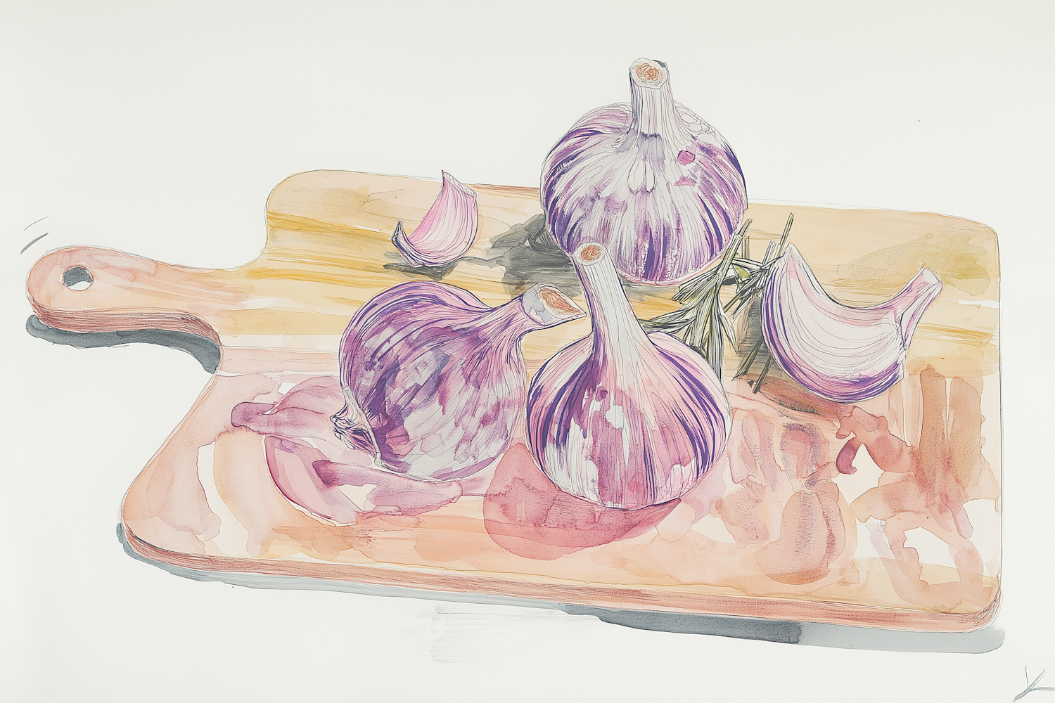Watercolor illustration of purple garlic and rosemary on a wooden cutting board, showcasing delicate brushwork and soft colors.