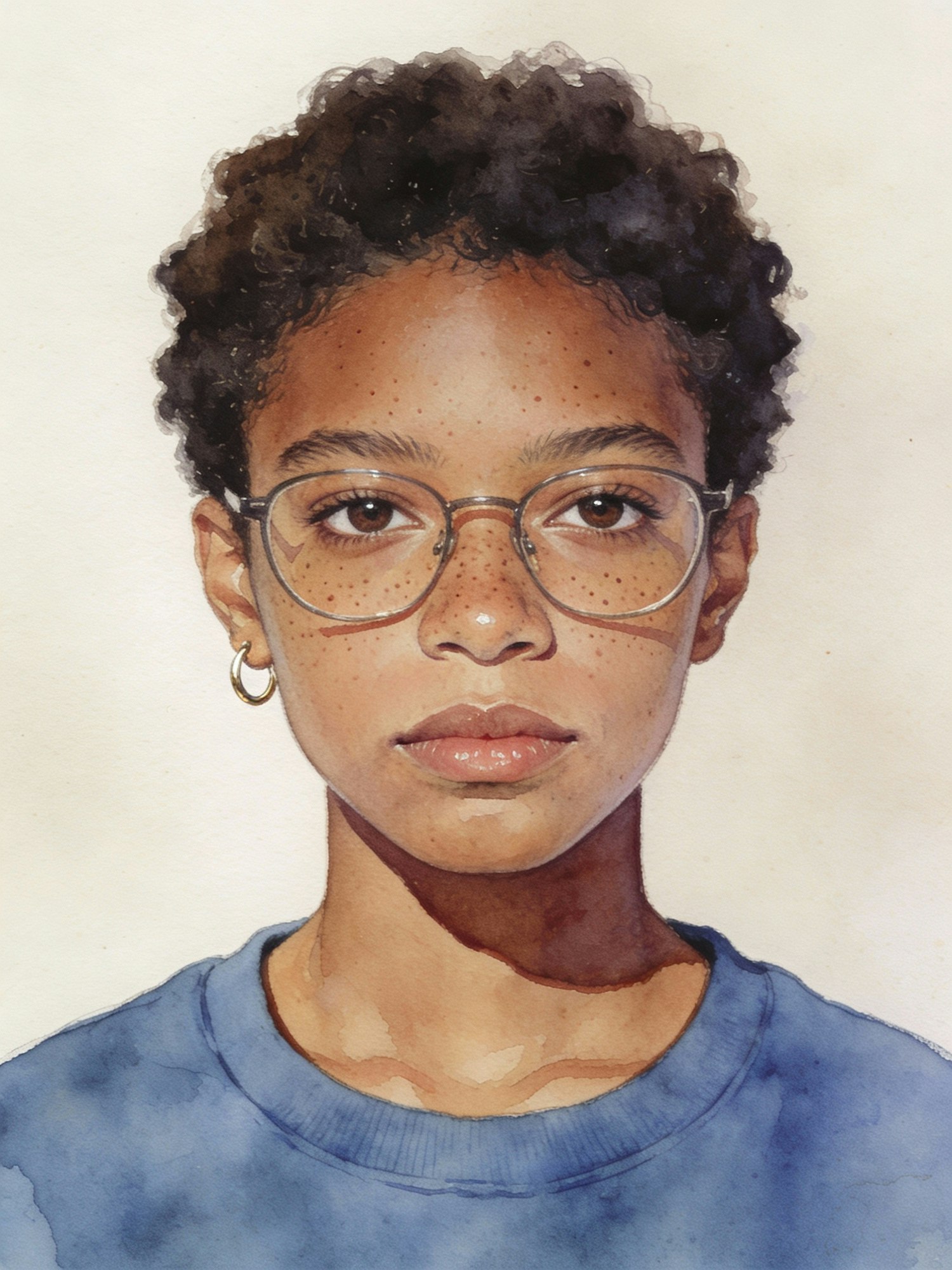 Watercolor portrait of a freckled individual with glasses, short curly hair, and a blue shirt, showcasing artistic detail and expression.