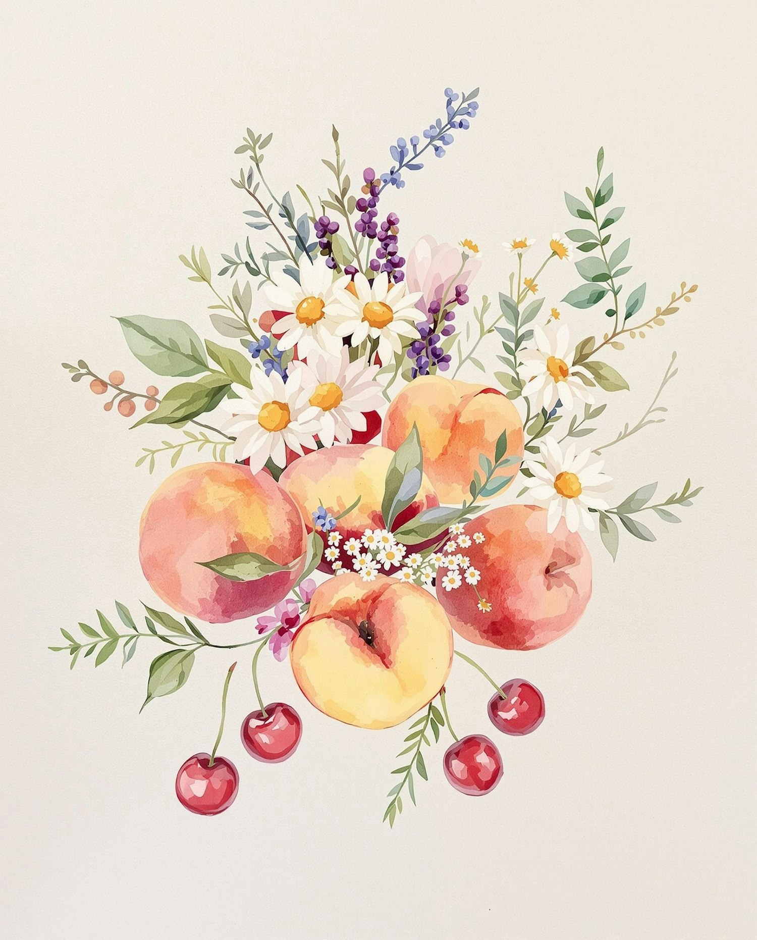 A lively watercolor featuring peaches, cherries, daisies, and lavender surrounded by lush green foliage on a soft pale background.