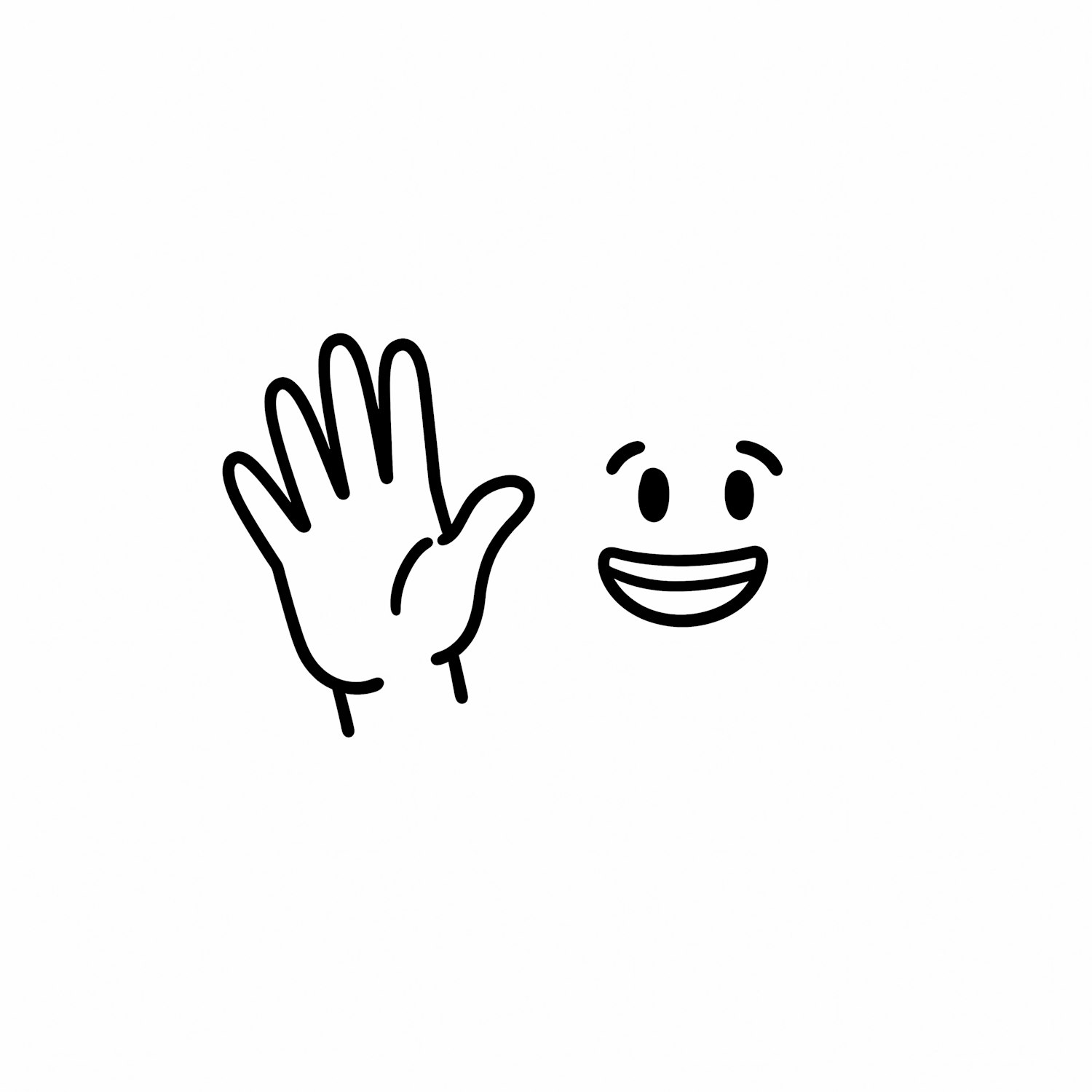 Minimalistic black-and-white illustration of a waving hand and a smiling face, conveying a friendly and welcoming vibe.