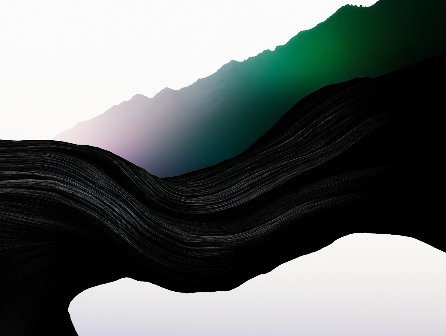 Abstract art with wavy black textures against a gradient background of white, purple, and green tones, evoking a serene, ethereal vibe.