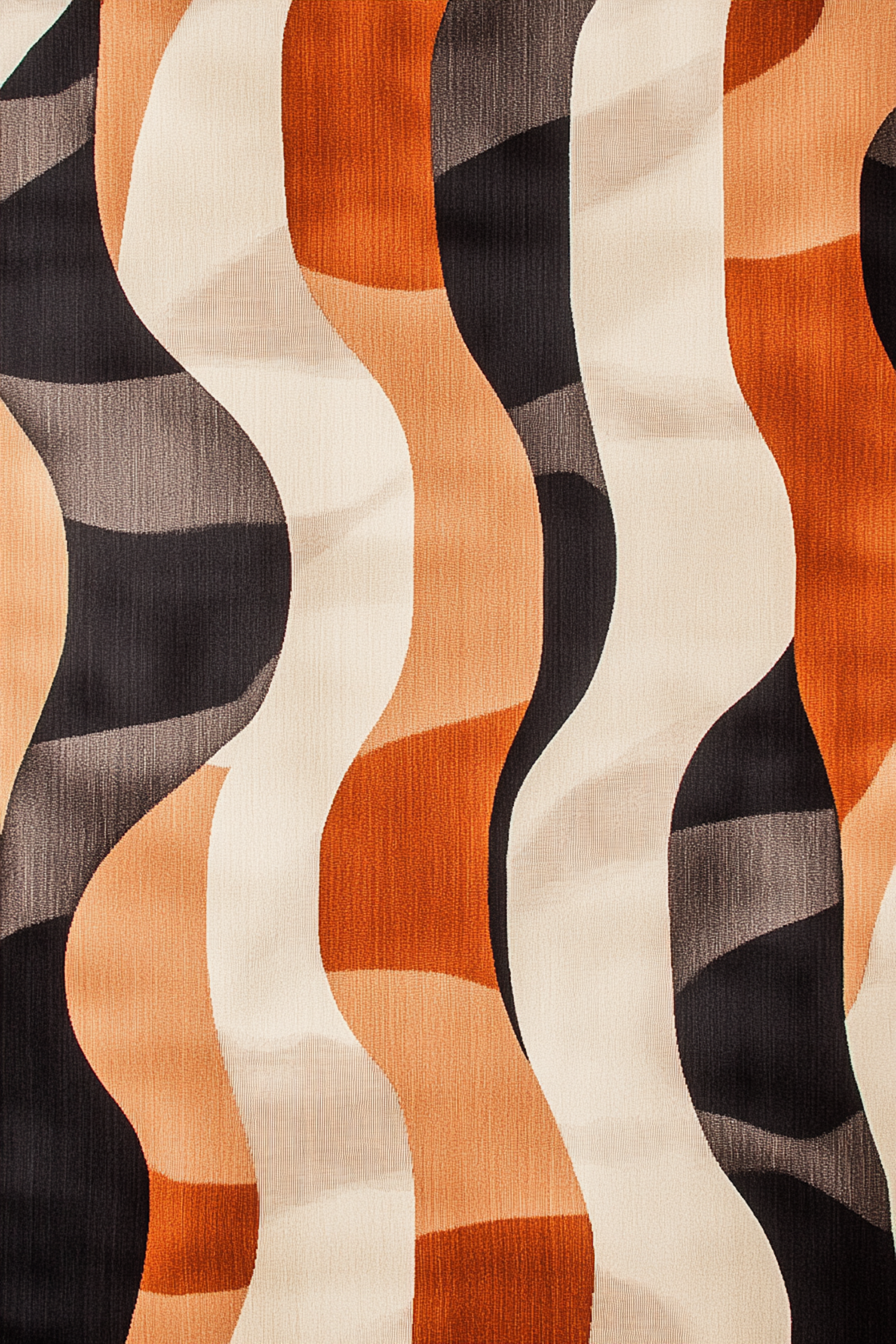 Abstract wavy pattern with orange, beige, black, and gray stripes, creating a dynamic and fluid design.
