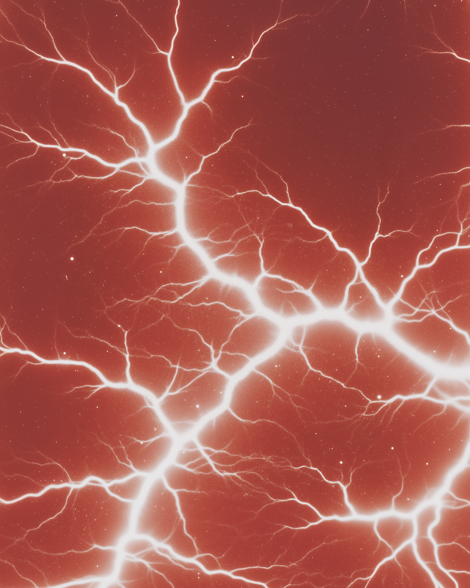 An intricate display of glowing white streaks resembling electrical discharges on a rich red background, creating an energized and dynamic pattern.