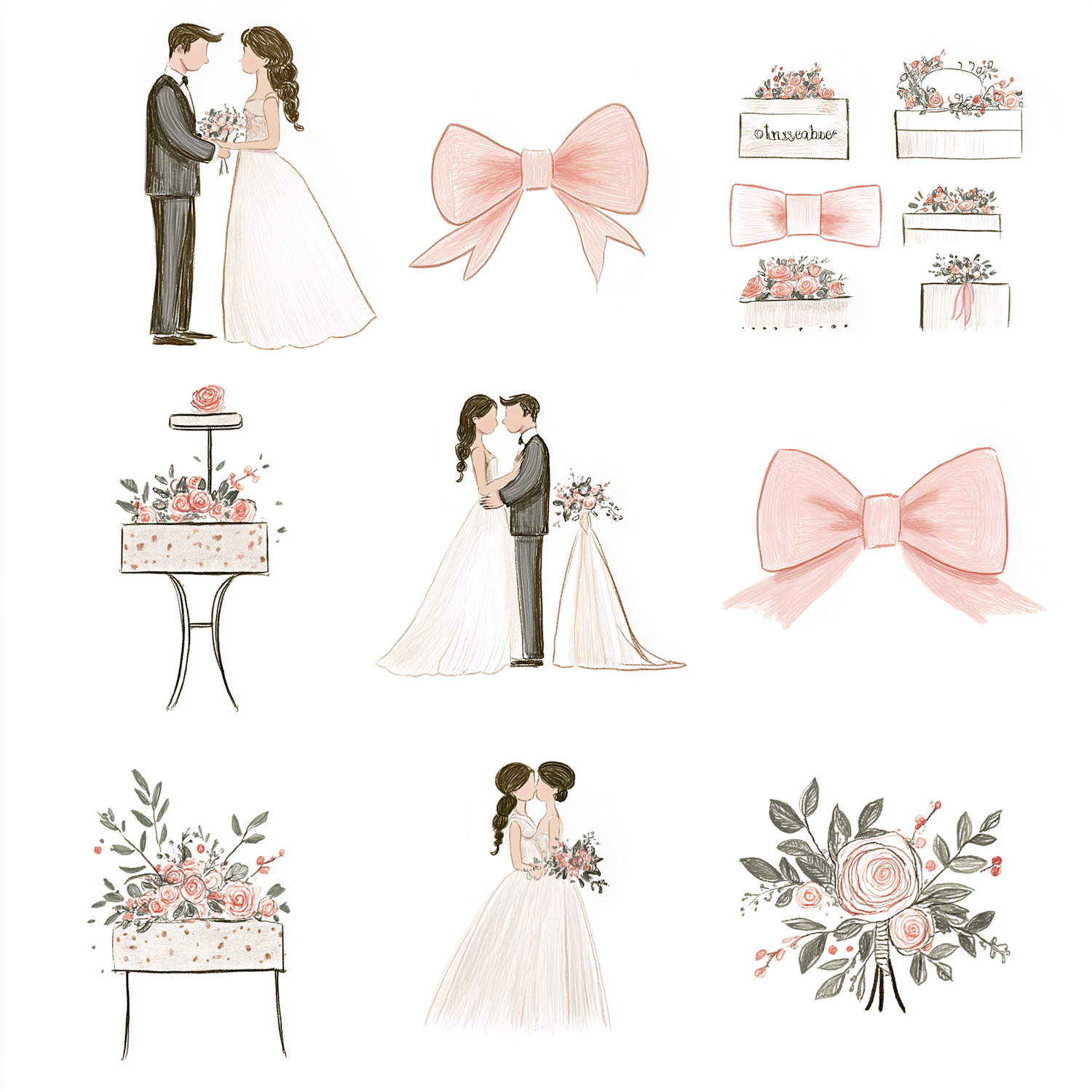 Romantic wedding illustrations with couples, floral arrangements, pink bows, and a tiered cake in soft pastel tones.