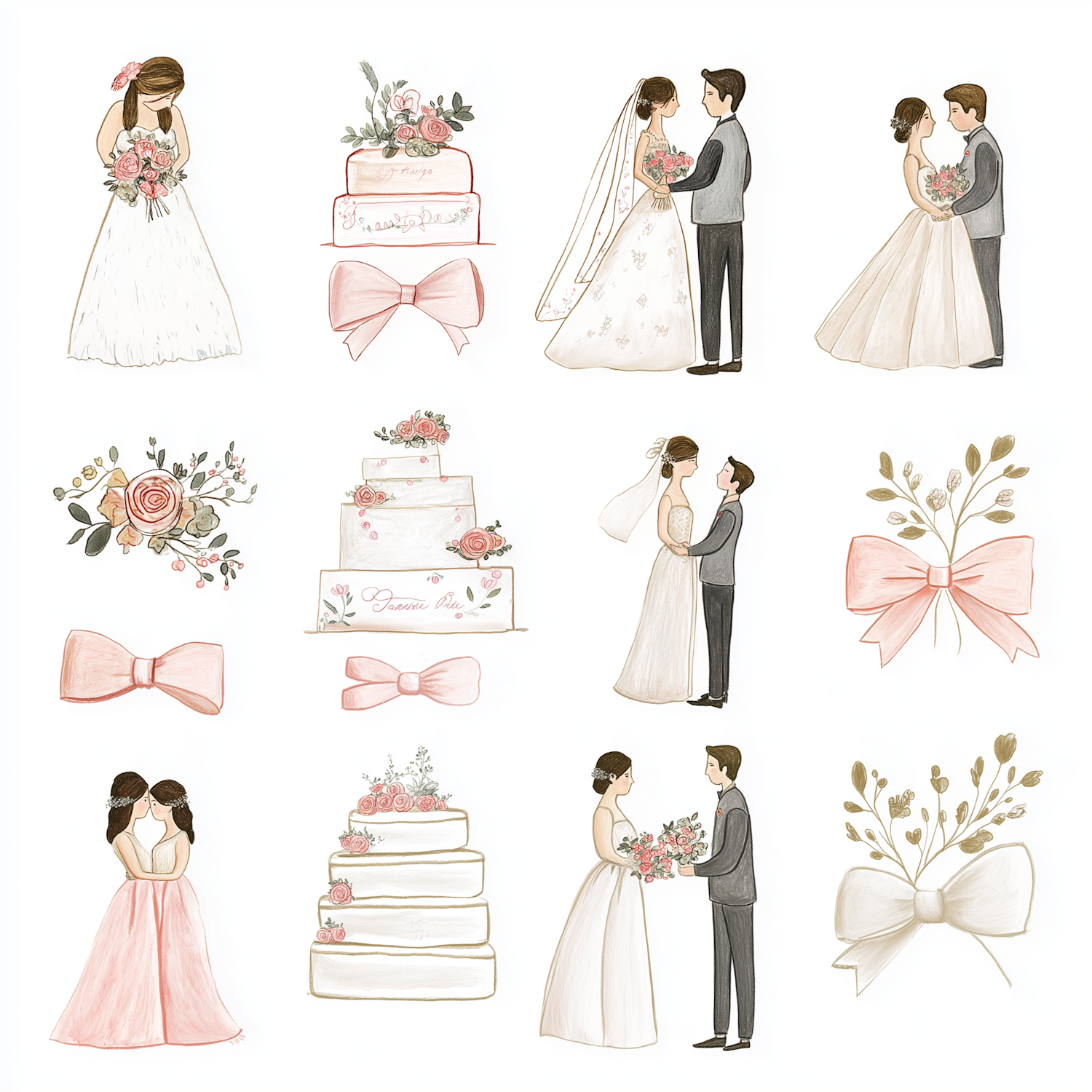 Whimsical wedding illustrations with couples, floral cakes, and pastel bows. Perfect for romantic designs or wedding-themed projects.