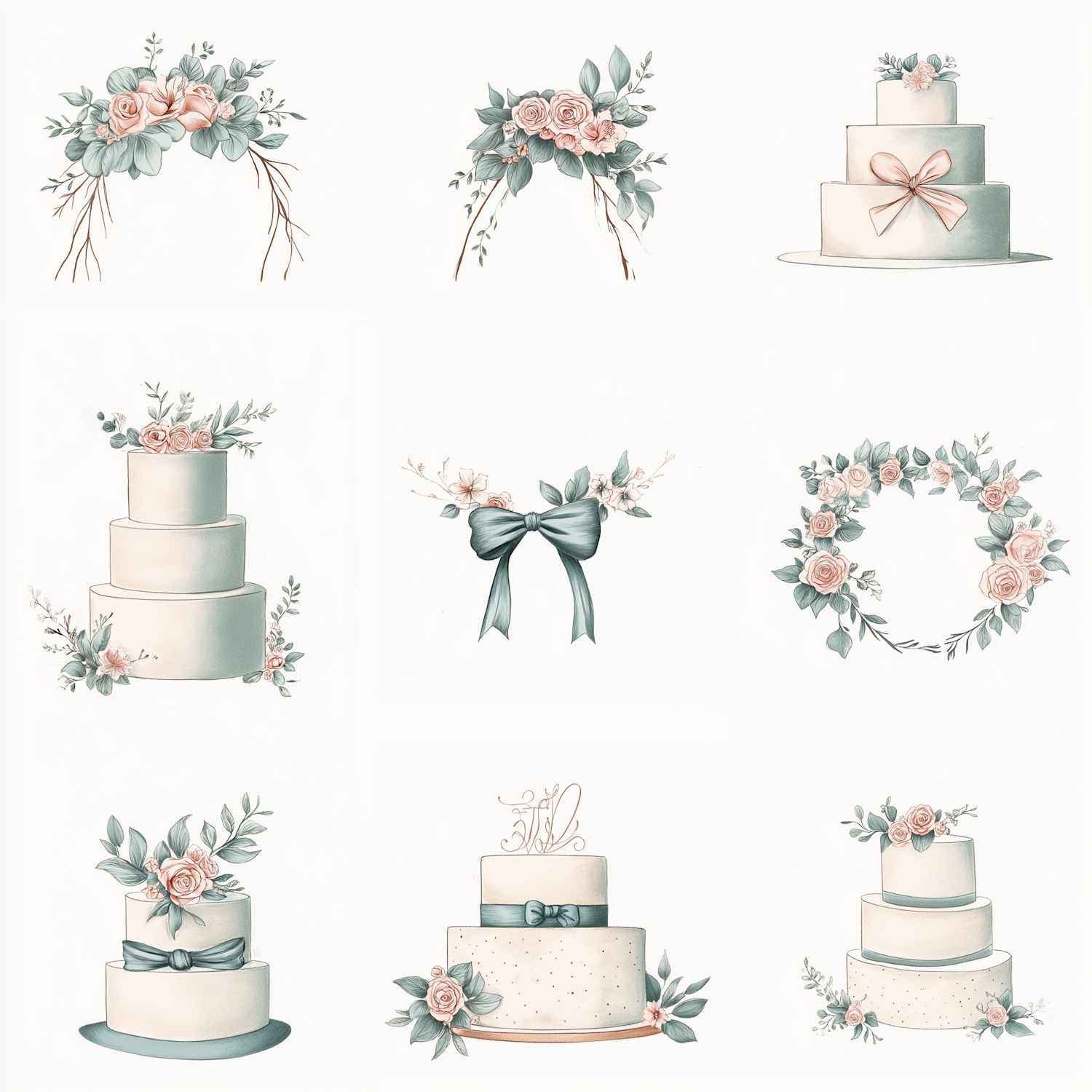 Elegant wedding-themed illustrations with pastel floral accents, tiered cakes, and decorative bows in blush pink and sage green tones.
