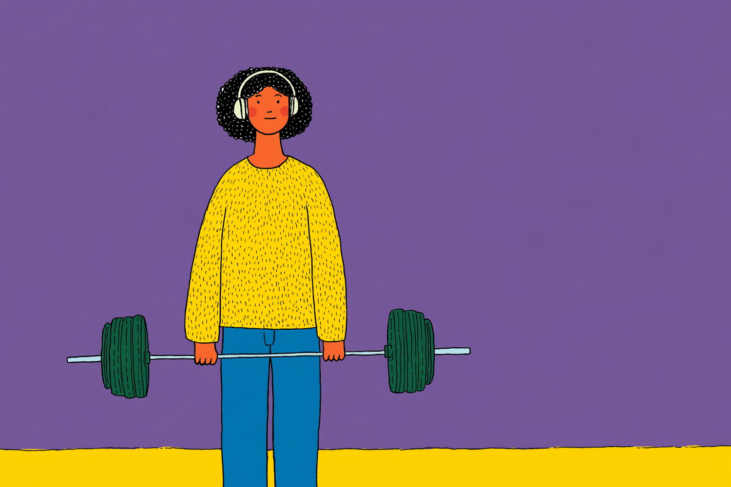 Illustration of a person lifting a barbell, wearing a yellow sweater and blue pants, set against a vibrant purple and yellow background.